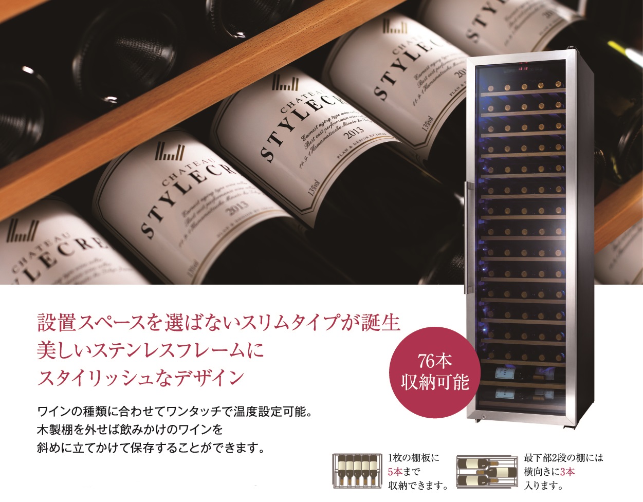 収納本数76本、木製棚×14枚+下段2枚 |