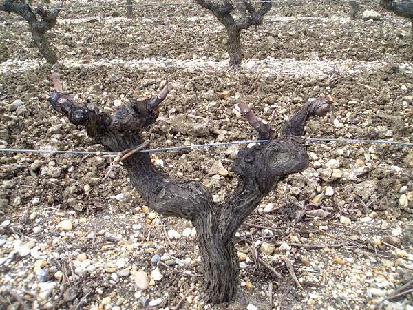 - “コット”と呼ばれる方法で剪定されたブドウの樹。1枝に2つの芽を残し、合計4枝あります