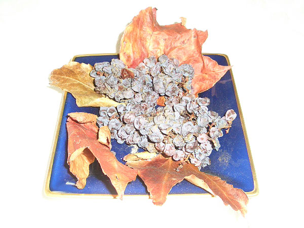 - 試飲テーブルに飾られたブドウ。貴腐化しているため、果実は萎んでいます
