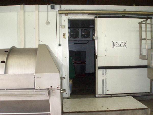 ちょうど圧搾機の隣には、“クリオ・エクストラクション”用の大型冷凍庫がありました。これは、ブドウを凍らせた後に圧搾機で搾ることで、水分だけを凍らせて分離させ、0度で凍らない糖分を含んだエキス分のみを凝縮した果汁を得るために行われます。