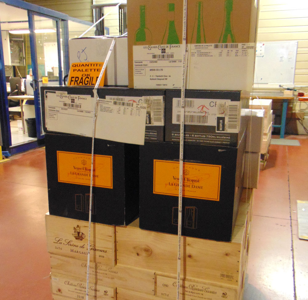 ワインは非常にデリケートな飲み物です。生産者のセラーでは、瓶詰めされたワインをそのまま輸送するのではなく、まず「パレット」と呼ばれる木製の台に丁寧に積み上げ、輸送中に動かないようしっかりと固定します。さらにその上からシュリンクラップを巻き、振動や衝撃から守ることで、ワインはようやくセラーを後にします。