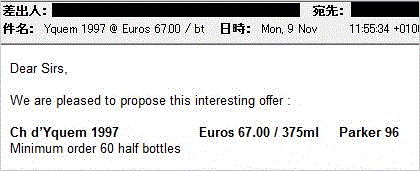こちらのオファーは実際にボルドーのある大手ワイン商から受け取った特別オファーですが、世界最高峰の貴腐ワイン、シャトー・ディケムの超優良年である1997年のハーフボトルが、なんと67ユーロでオファーが来ています。現在のレートに換算すると、なんと8,174円(1ユーロ=122円)!(2016/12/20現在)
