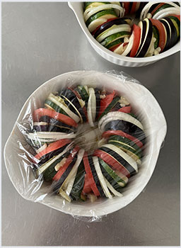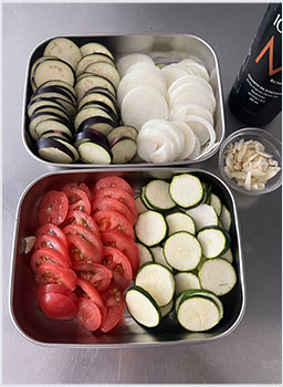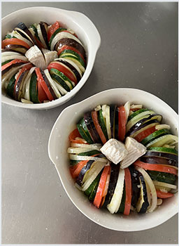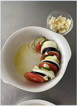 1人分のグラタン皿にオリーブオイル大さじ1/2程度を引き、その上にスライスした野菜を写真のように交互に縁に沿わせながら並べていく。時々にんにくを挟み込む。