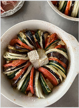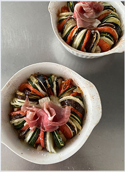 "ティアン"とはプロヴァンス地方のお料理で、耐熱皿に薄切りのお野菜を並べて焼いたもの。プロヴァンスのロゼワインに合わせた野菜の組み合わせに、チーズや生ハムを添えることで赤ワインにも合う、おもてなしにもぴったりの一皿に仕上げています。