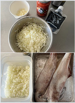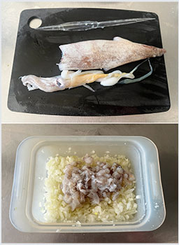やりいかは洗って内臓と背骨、げそを取り出し、げそを粗みじんにする。玉ねぎをみじん切りにする。(げそ以外は使用しない)