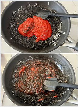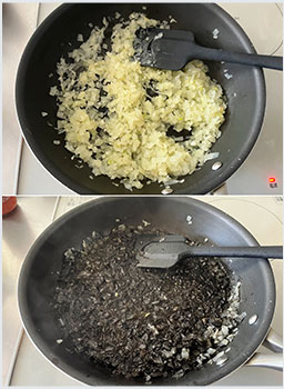 深めのフライパンにオリーブオイルを入れ熱したら、玉ねぎのみじん切りの半量とにんにくを入れ、塩をふたつまみ振って軽く混ぜ、蓋をして弱火で3分蒸し炒めにする。イカ墨ペーストまたは液体を加え、ペーストの場合は白ワイン100ml、液体の場合は白ワイン50mlを加え中火で煮立たせる。