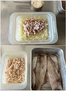 残りの玉ねぎと粗みじん切りにしたゲソを耐熱皿に入れて塩ふたつまみ加え、ラップ(蓋)をして600Wで2分加熱する。パン粉を加えて混ぜ合わせ、粗熱をとる。