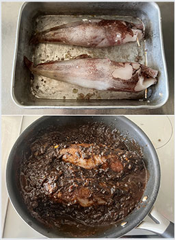 ヤリイカの胴に詰めて楊枝で閉じ、ソースを作ったフライパンに加えて再び蓋をして10分煮込む。ソースの塩気を確認し、必要であれば塩で調味する。