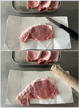 豚肉は脂の部分に切り込みを入れ、麺棒などを使って1.5倍くらいの大きさに伸ばす。