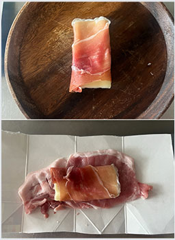 半分に折ったスライスチーズを生ハムで巻き、豚肉の中央に乗せ、もう1枚で上から挟んで周りをしっかりと押さえる。