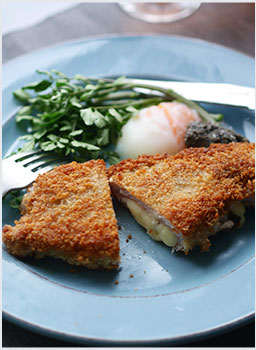 フレンチの定番コルドンブルーは、鶏胸肉を包丁で開いて中にハムとチーズを入れ、パン粉を付けて揚げるお料理ですが、お肉を均等な厚みに開くのはなかなか大変!そこで、とんかつ用のお肉で代用し、揚げ焼きにして作りやすくアレンジしました。温泉卵とタプナードを添え、お子様から大人のおつまみまで、みなさまに喜ばれるレシピに仕上げました。