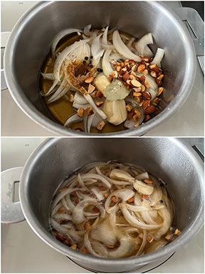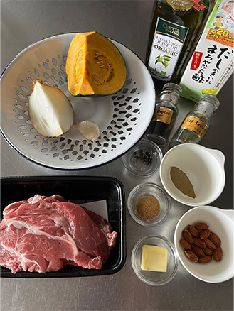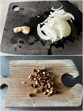 玉ねぎは薄切りに、にんにくは潰して、アーモンドは粗く刻む。オーブンを180℃に予熱する。