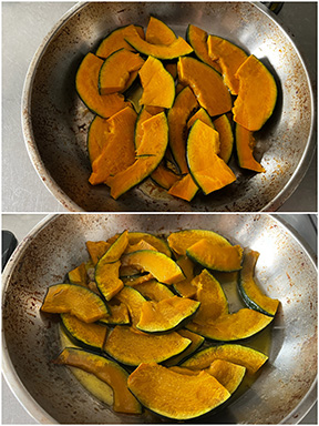5mmの厚さの食べやすい大きさに切ったかぼちゃを耐熱皿に乗せ、オリーブオイルを回しかける。180℃のオーブンで15〜20分焼く。