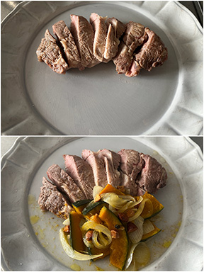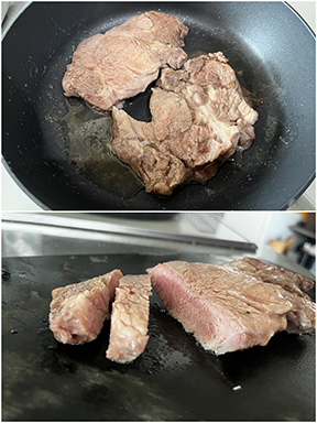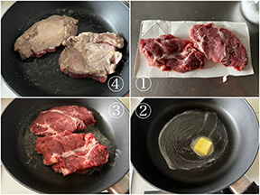 肉は厚みを1.5センチになるように繊維を断ち切る方向に2等分し、両面に満遍なく塩を振る。フライパンにバターを入れて中火で熱し、バターが全て溶けたら肉を入れて弱めの弱火に落とし、1分加熱する。
