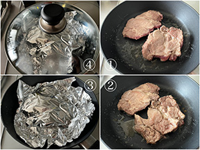 肉を返してさらに1分加熱する。これを5回繰り返す。火を止めたら、ホイルで肉全体を覆ってさらに蓋をして4分保温する。