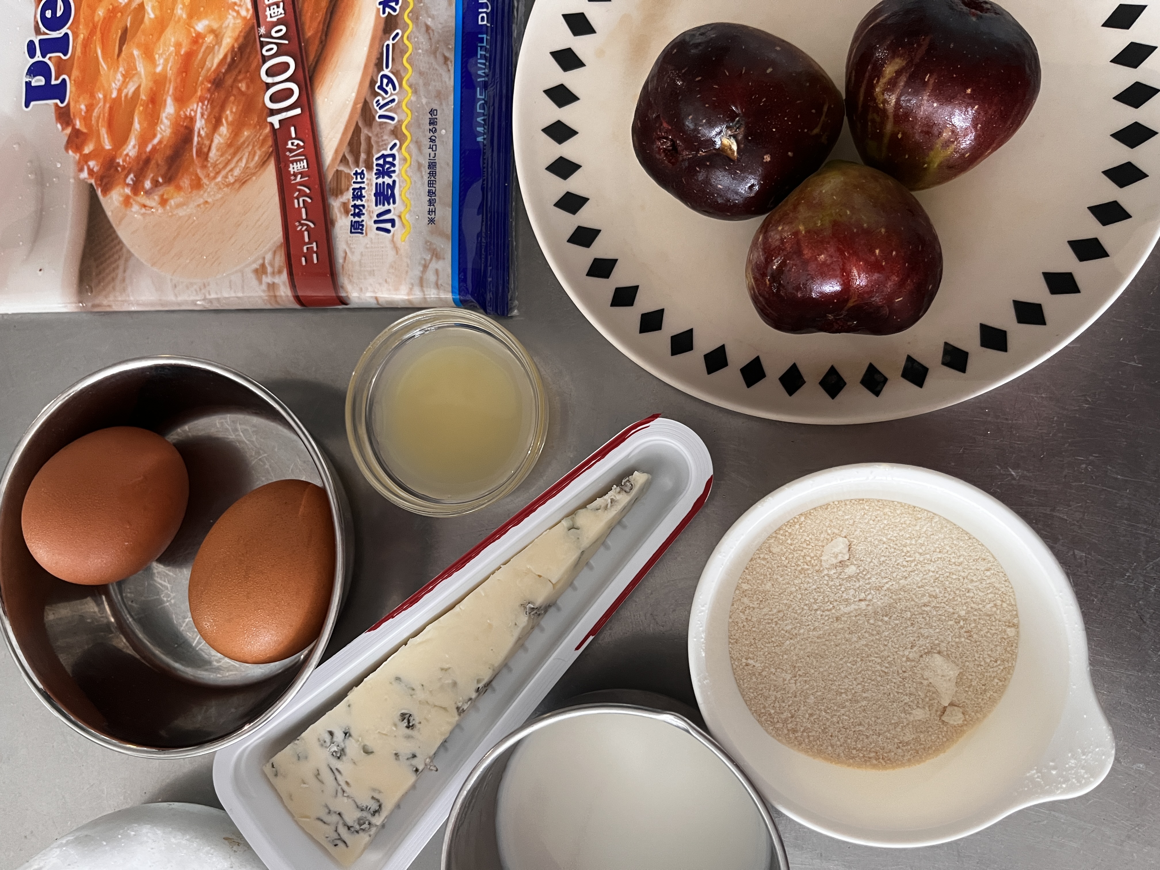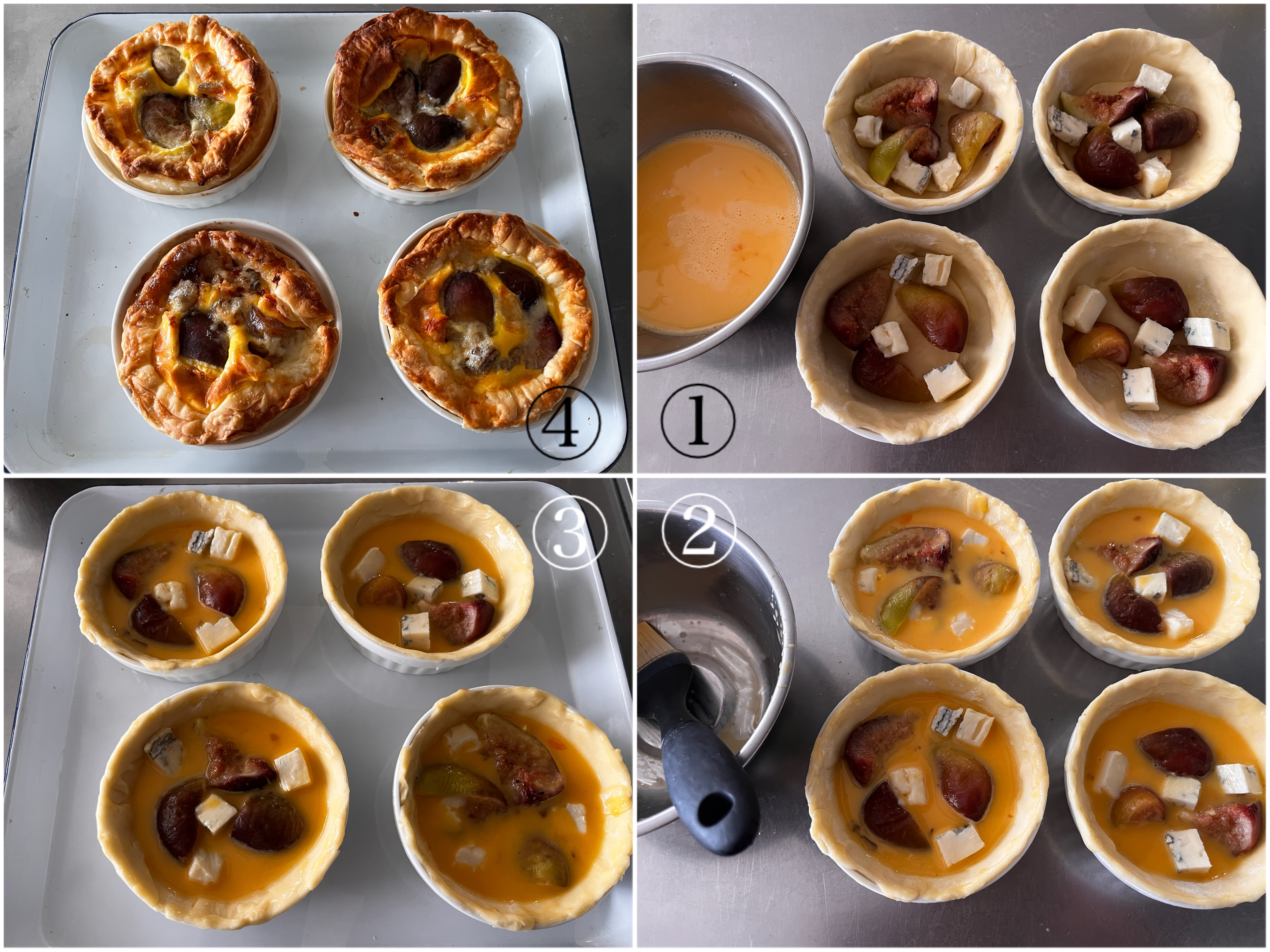 パイ生地にいちじくとブルーチーズを乗せ、3を流し入れる。周りのパイ生地に、ボウルに残った卵液をハケで塗ると、焼き上がり艶が出る。