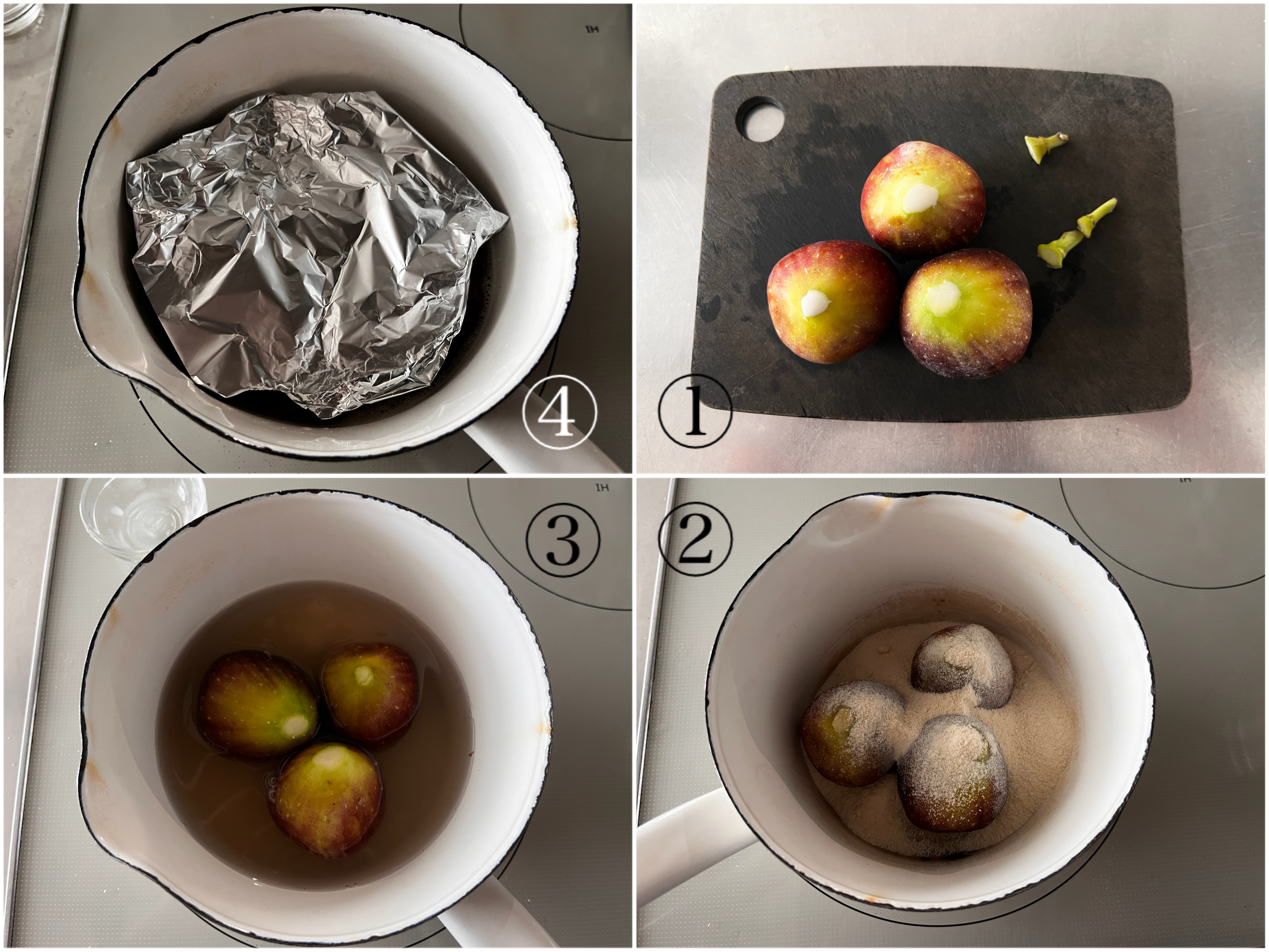 いちじくはヘタを切り落とし、小さめの鍋に砂糖とレモン汁と一緒に入れ、水をヒタヒタに注ぎ(だいたい200ml前後)、中火にかけて煮立ってきたら弱火にし、落とし蓋をして8分ほど煮る。火を止め、落とし蓋を外してそのまま粗熱をとる。