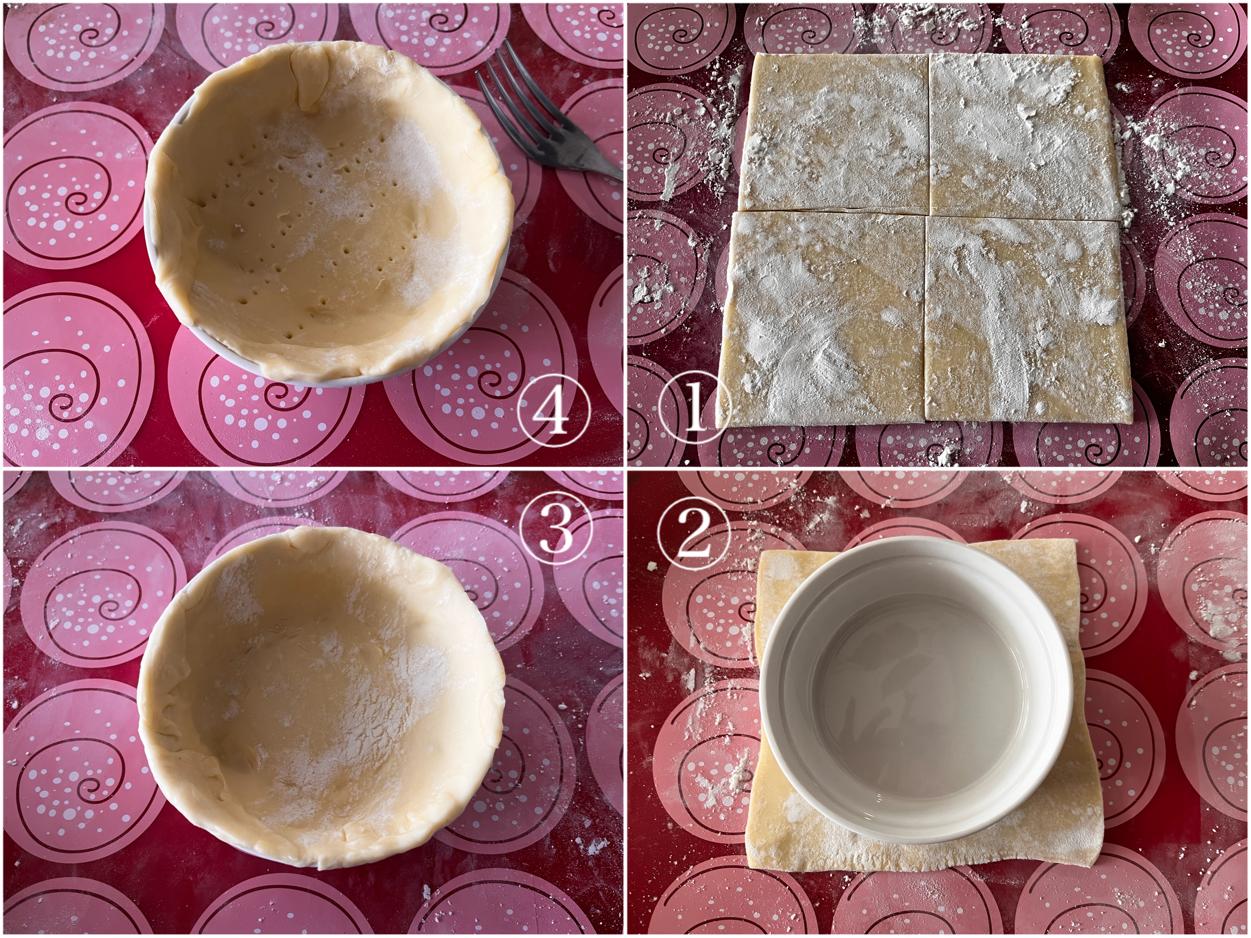 パイ生地は常温に戻して4等分に切り、しっかりと打ち粉をしてココットの大きさより一回り大きく伸ばす。バター(分量外)塗った型に敷き込み、はみ出た部分をナイフで切り取り形を整え、フォークなどで数箇所穴をあける。