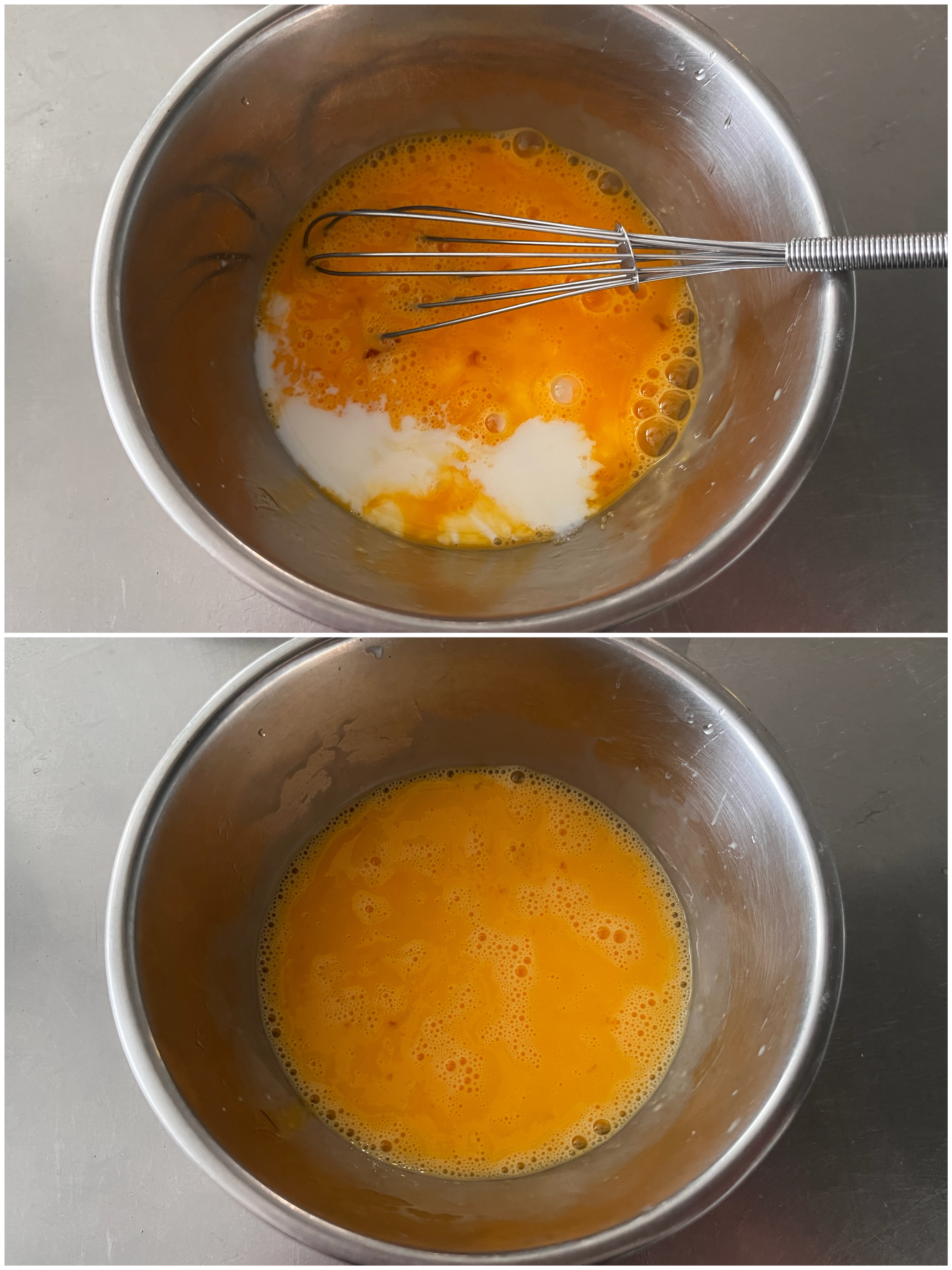 ボウルに卵をほぐし、牛乳と塩を加えてよく混ぜ合わせる。