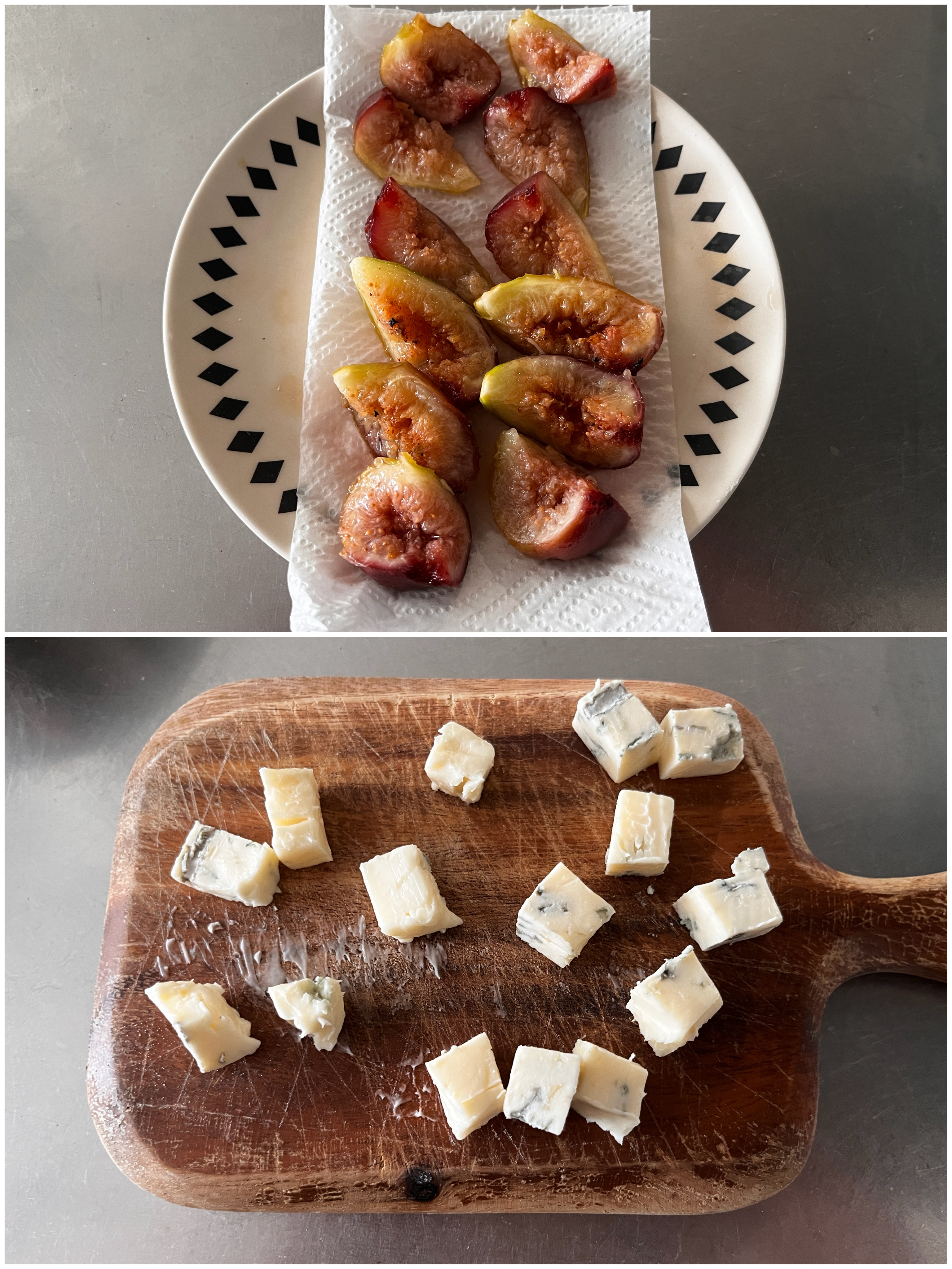 いちじくは縦4等分に切ってキッチンペーパーの上で水気を切る。ブルーチーズは1センチ角に切る。