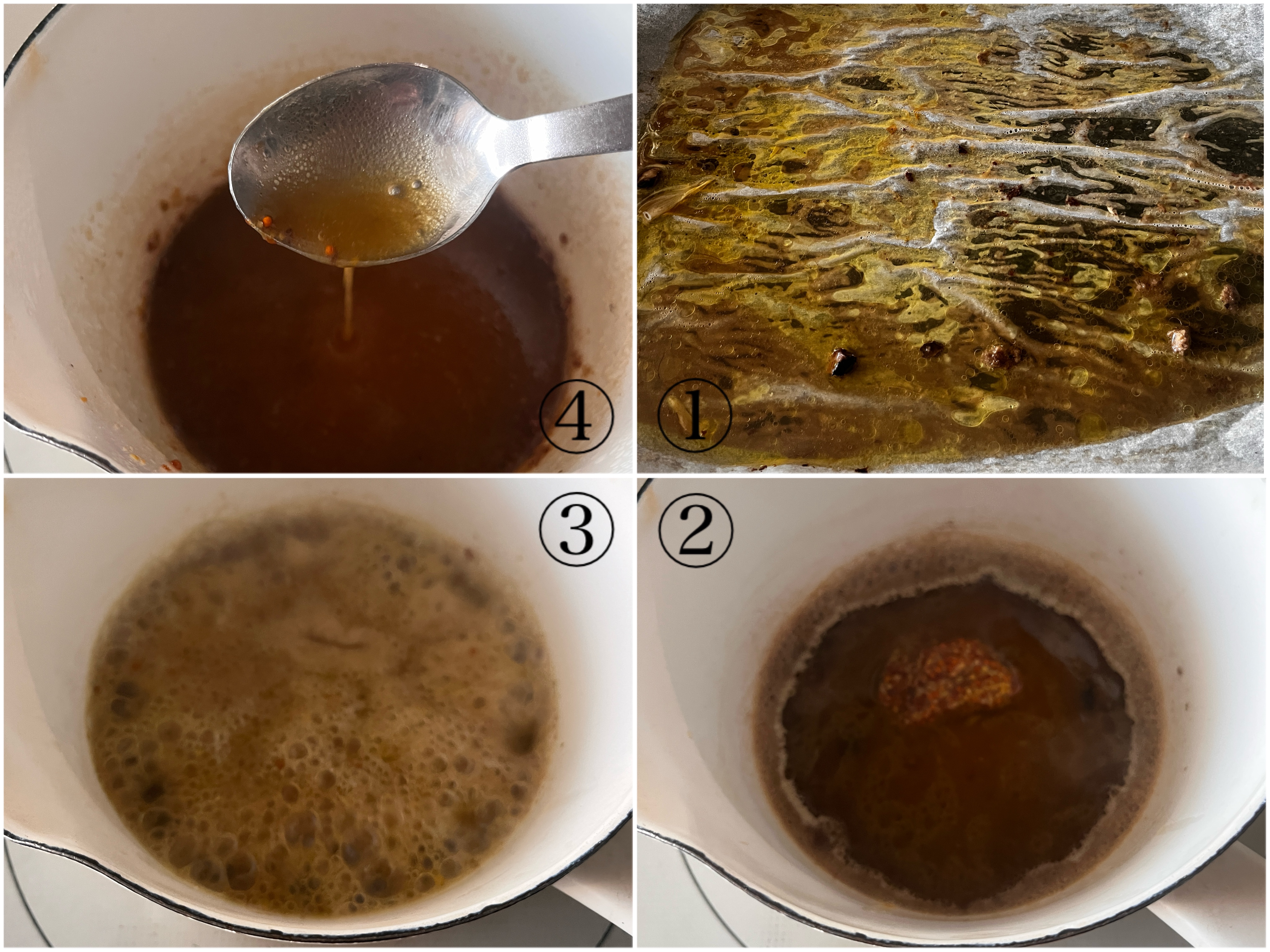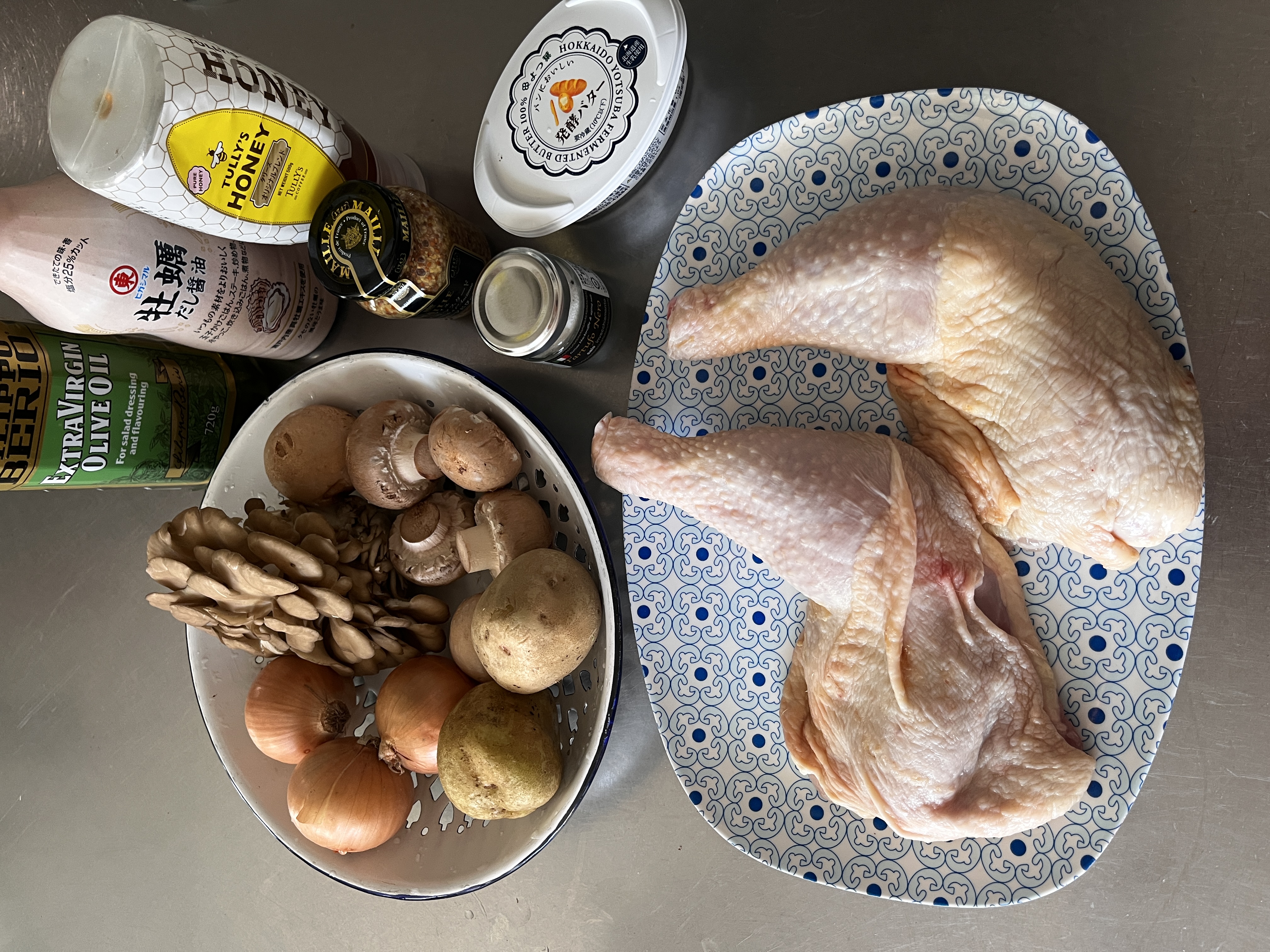 鶏肉と野菜を皿に盛り付け、天板に残った肉汁を小鍋に移す。粒マスタード、はちみつ、出汁醤油を加えて火にかけ、少しとろみが出るまで煮詰めてから玉ねぎとじゃがいもに回しかける。