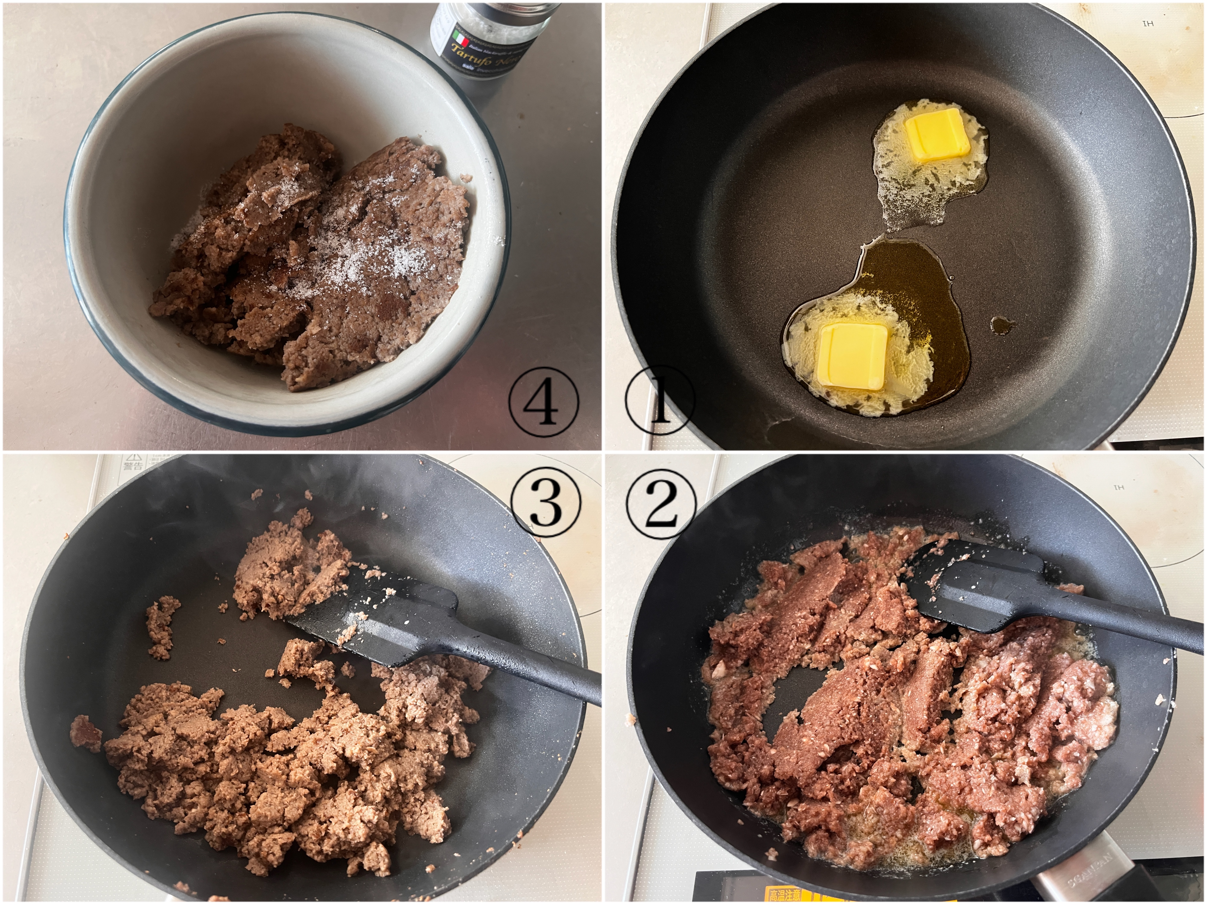 フライパンにバターとオリーブオイル小さじ1を入れて中火で熱し、熱くなってきたら1のきのこを一気に加えてフライパン全体に広げ、1分ほど動かさず加熱する。大きく全体を混ぜ合わせながら、中火のままじっくり7〜8分時々混ぜながら水分を飛ばす。 火を止め、トリュフ塩小さじ1/2を加えて混ぜ、冷ましておく。