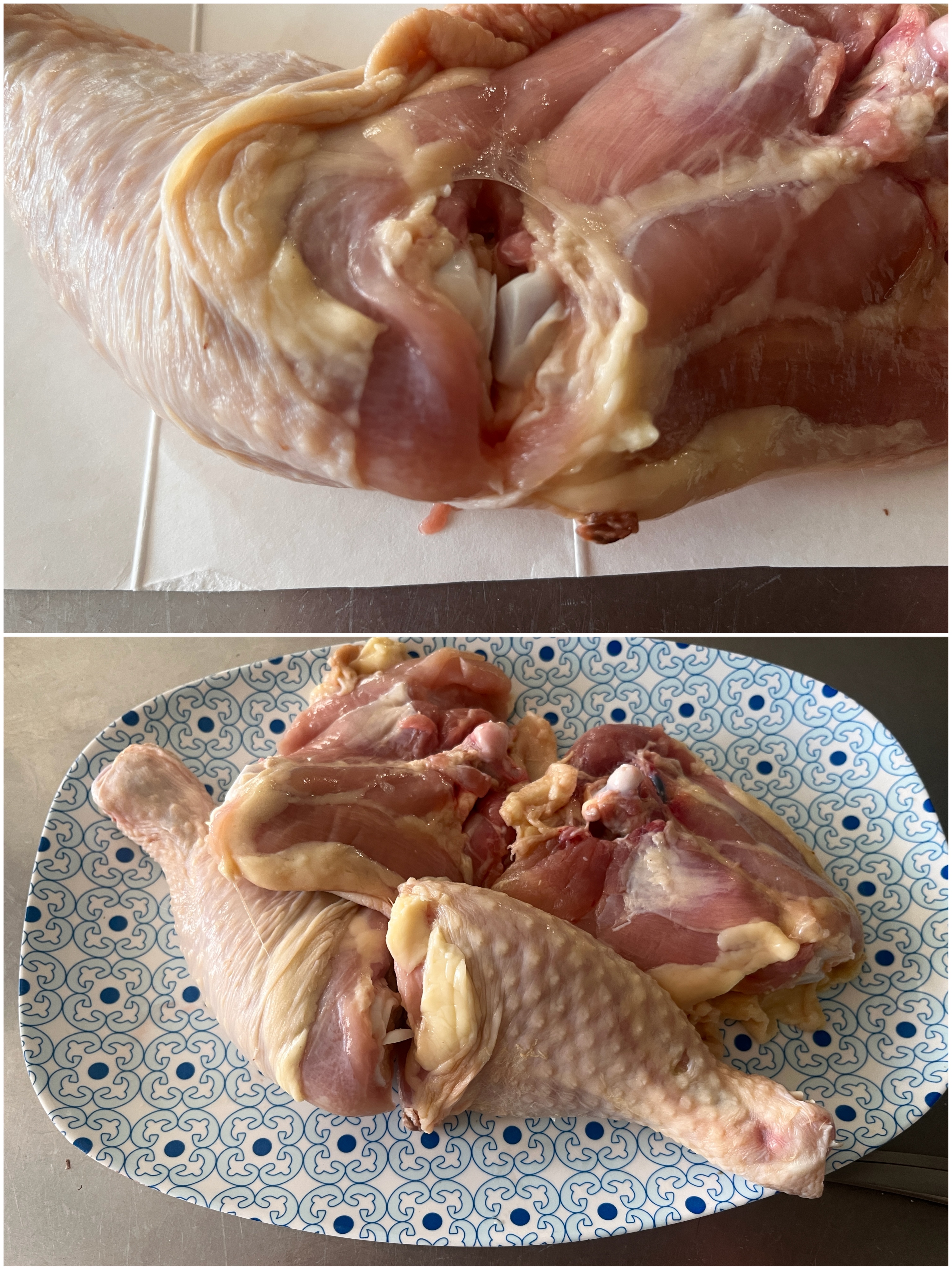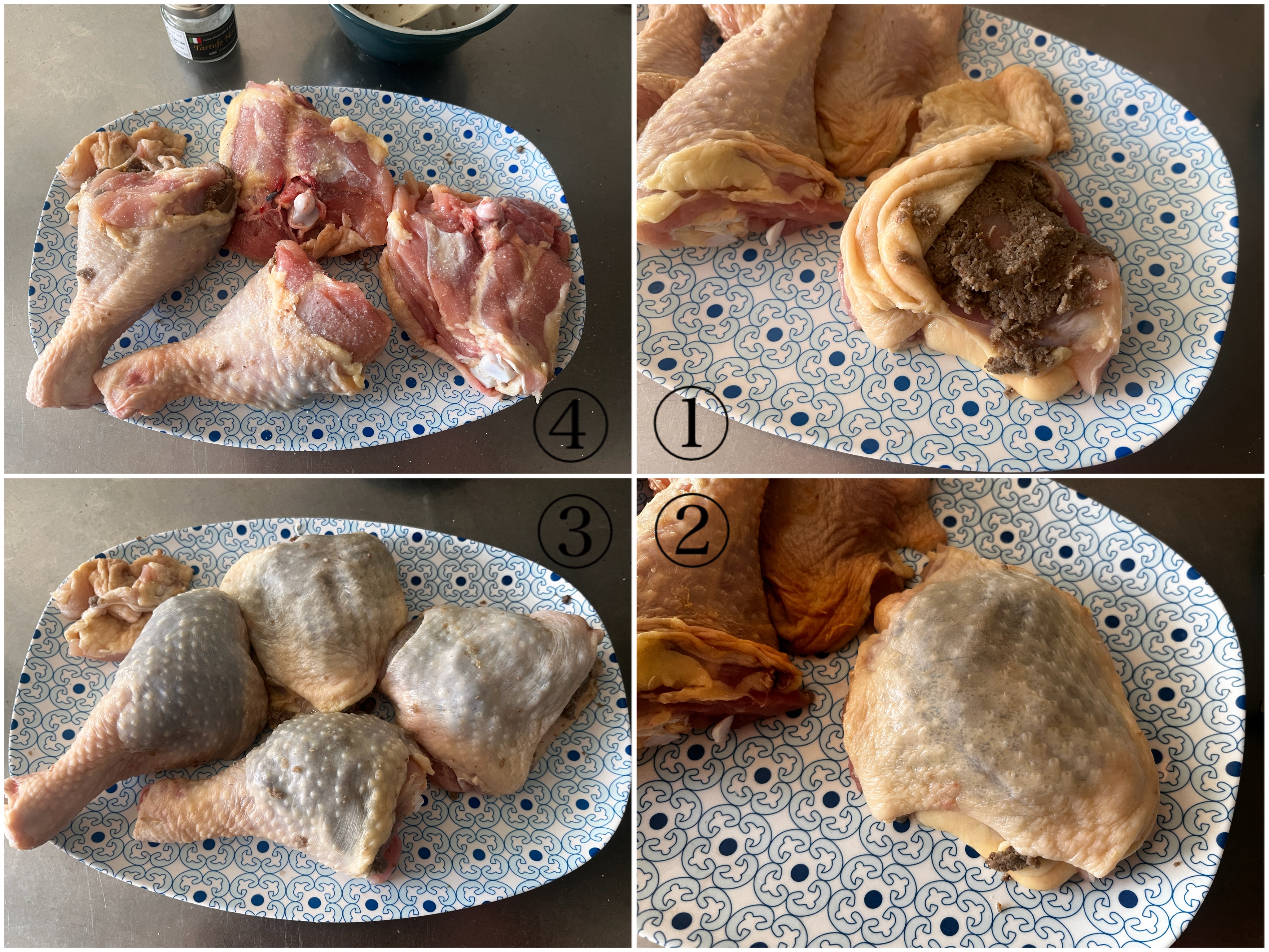 鶏もも肉は中央の関節(指でなぞると窪みあり)で半分に切り、余分な皮をハサミなどで切り取り形を整え、皮と身の間に3のペーストを塗る。鶏肉の両面にも軽くトリュフ塩を均等に振る。