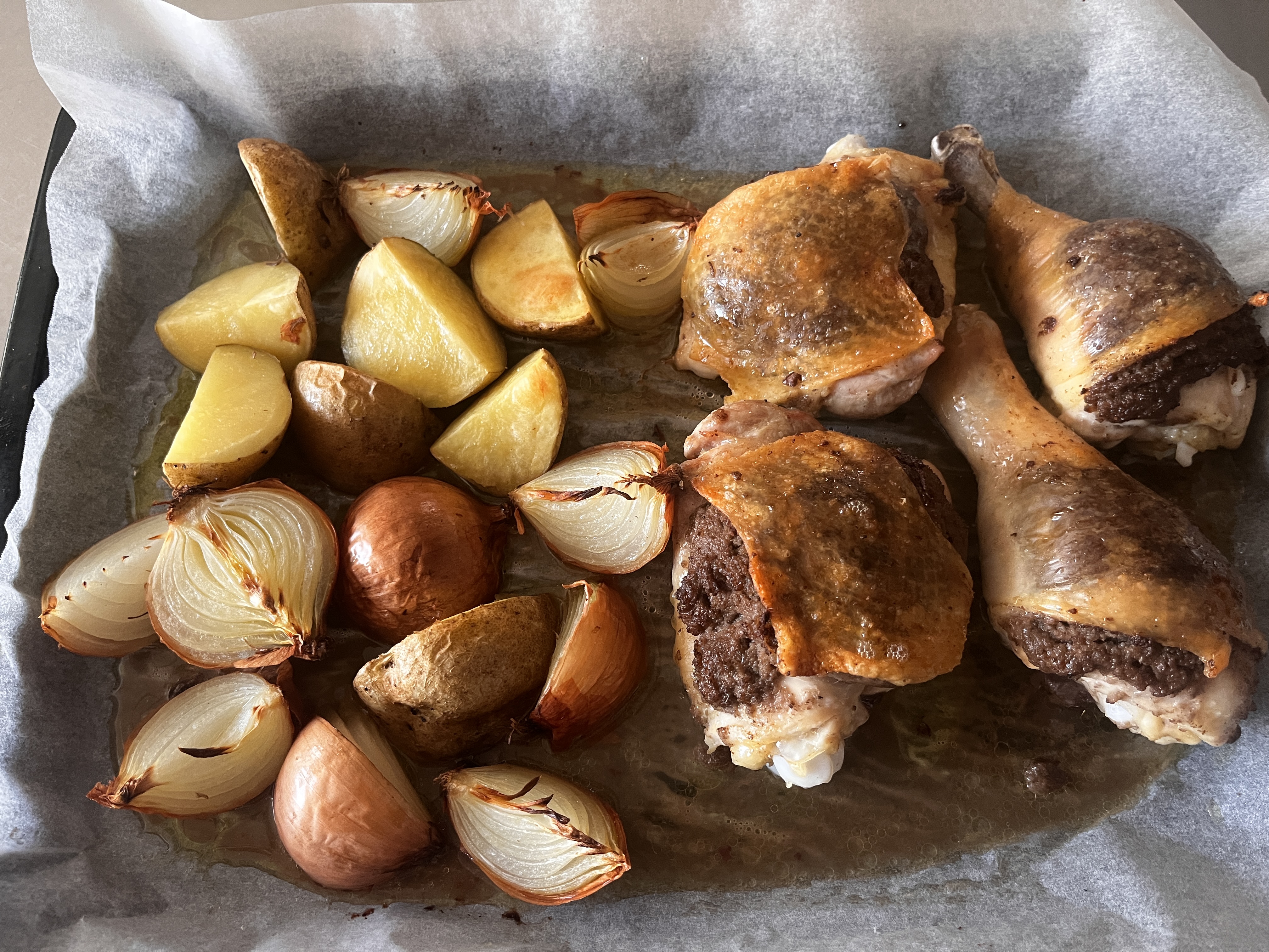 オーブンシートを敷いた天板に⑷と一口大に切ったじゃがいもと櫛形に切った玉ねぎ(皮付きでもなしでも)を乗せ、野菜にはオリーブオイルを軽くまわしかける。鶏肉の皮目にオリーブオイルをはけで塗り、200℃で40分前後、こんがりと焼き色がつくまで焼く。