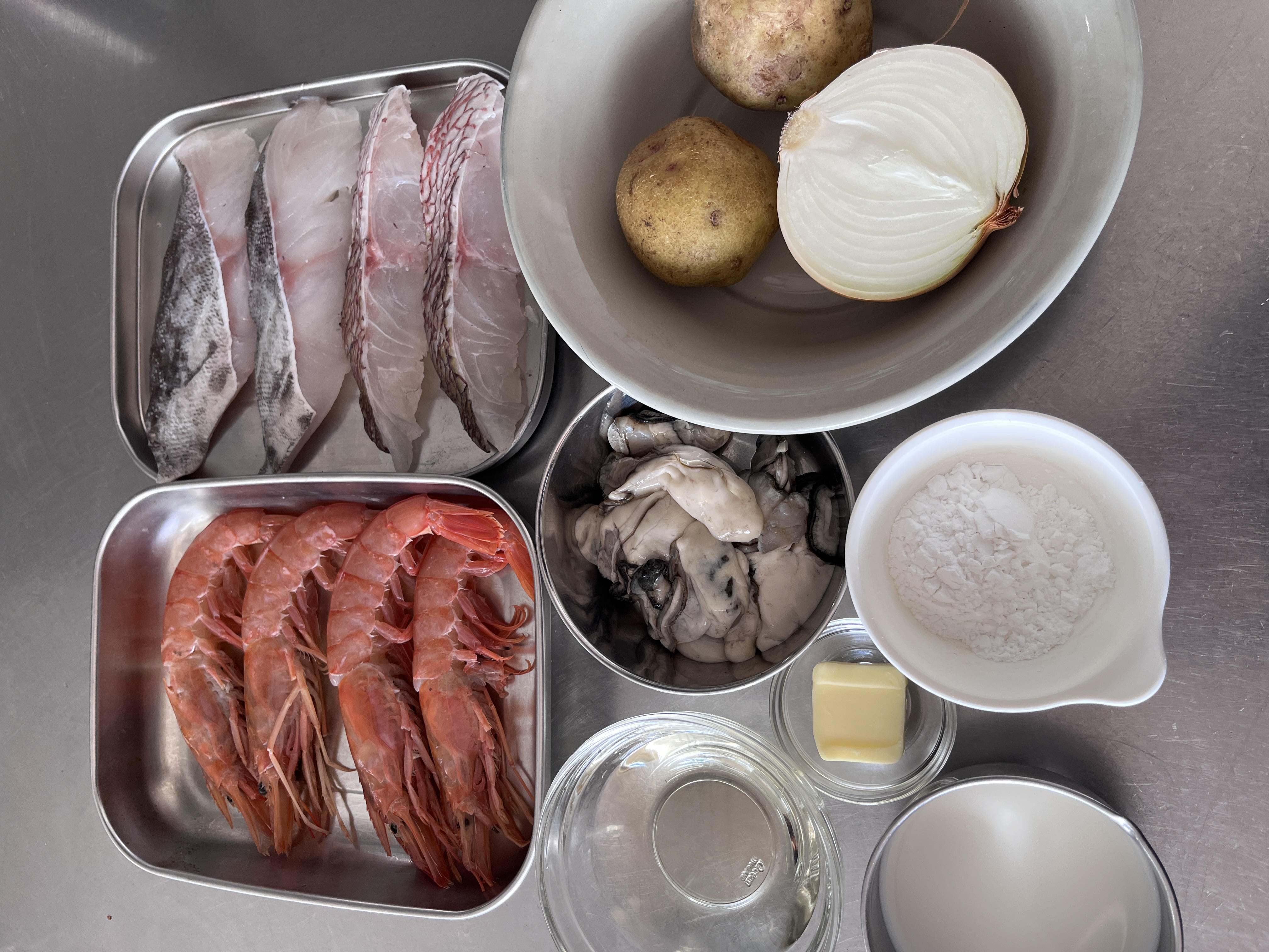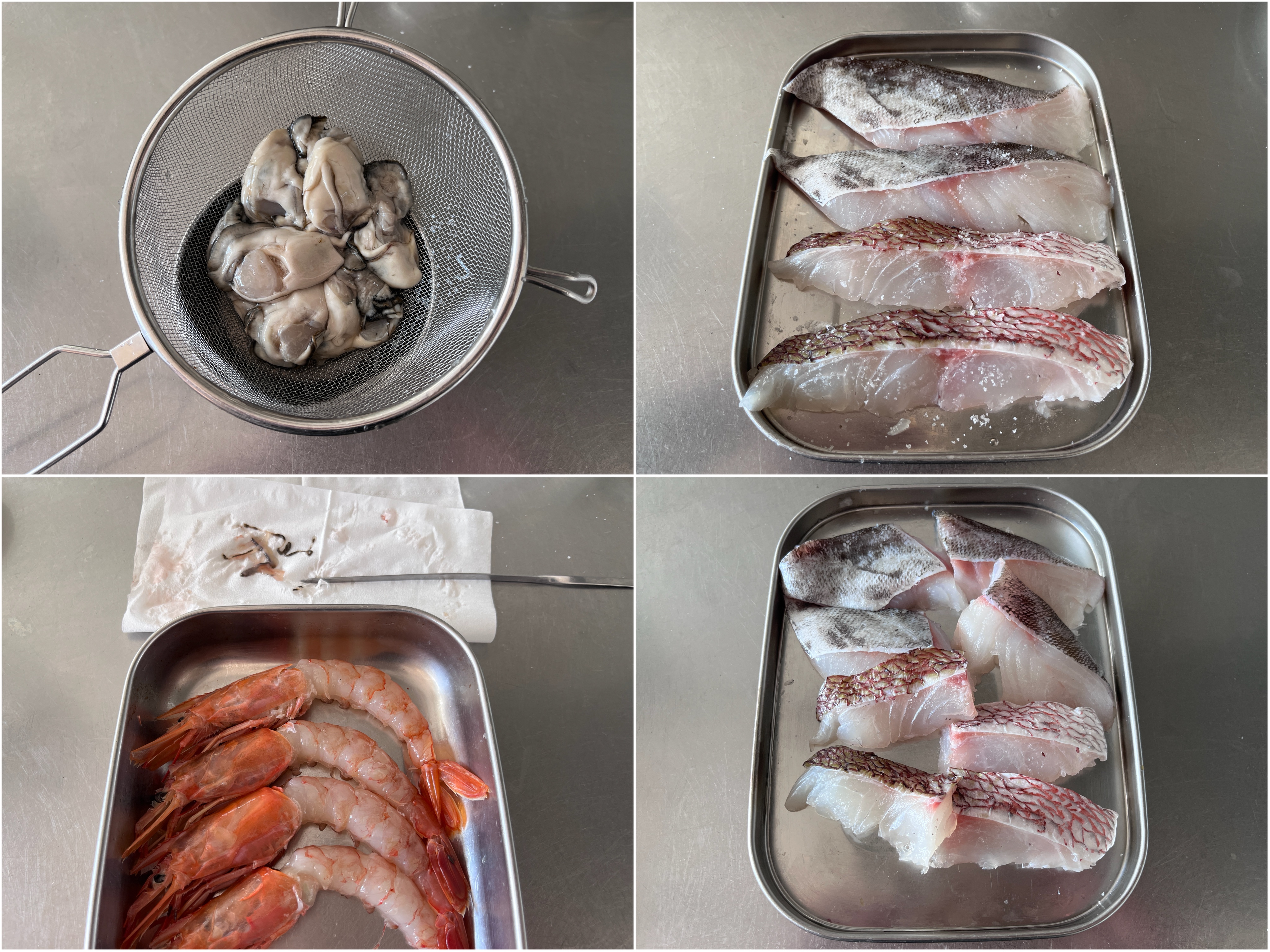 鱈、真鯛の両面に軽く塩を振り(分量外)、5分置いて水気を拭き取り、食べやすい大きさに切る。えびは頭はつけたまま殻をむいて背腸をとる。牡蠣は塩をひとつまみ振って優しく揉み、流水で洗い流して水気を切る