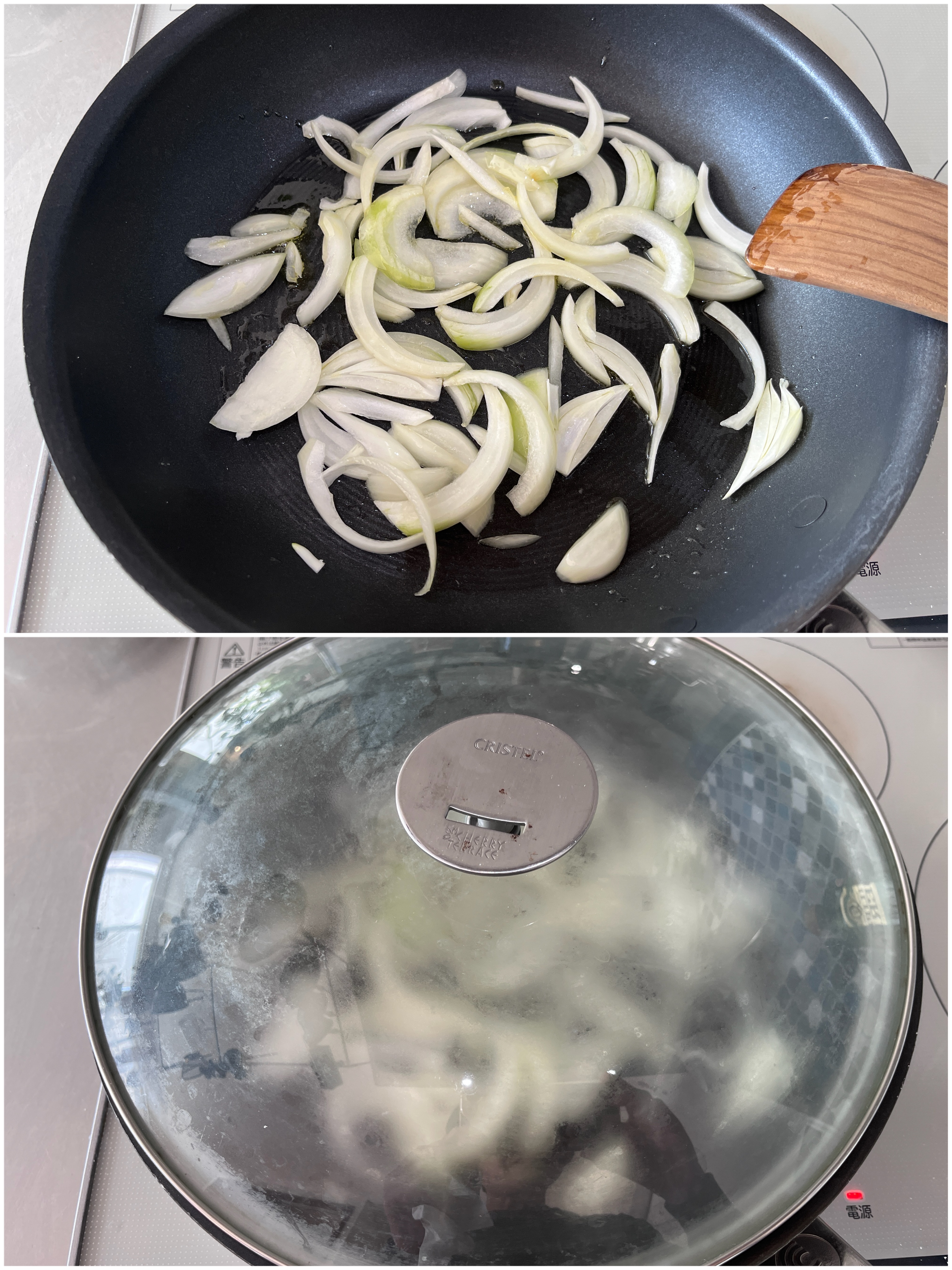 フライパンにオリーブオイルを熱し、玉ねぎを加えて塩をひとつまみ振って軽く炒め、蓋をして弱火で2~3分蒸し炒めにする。