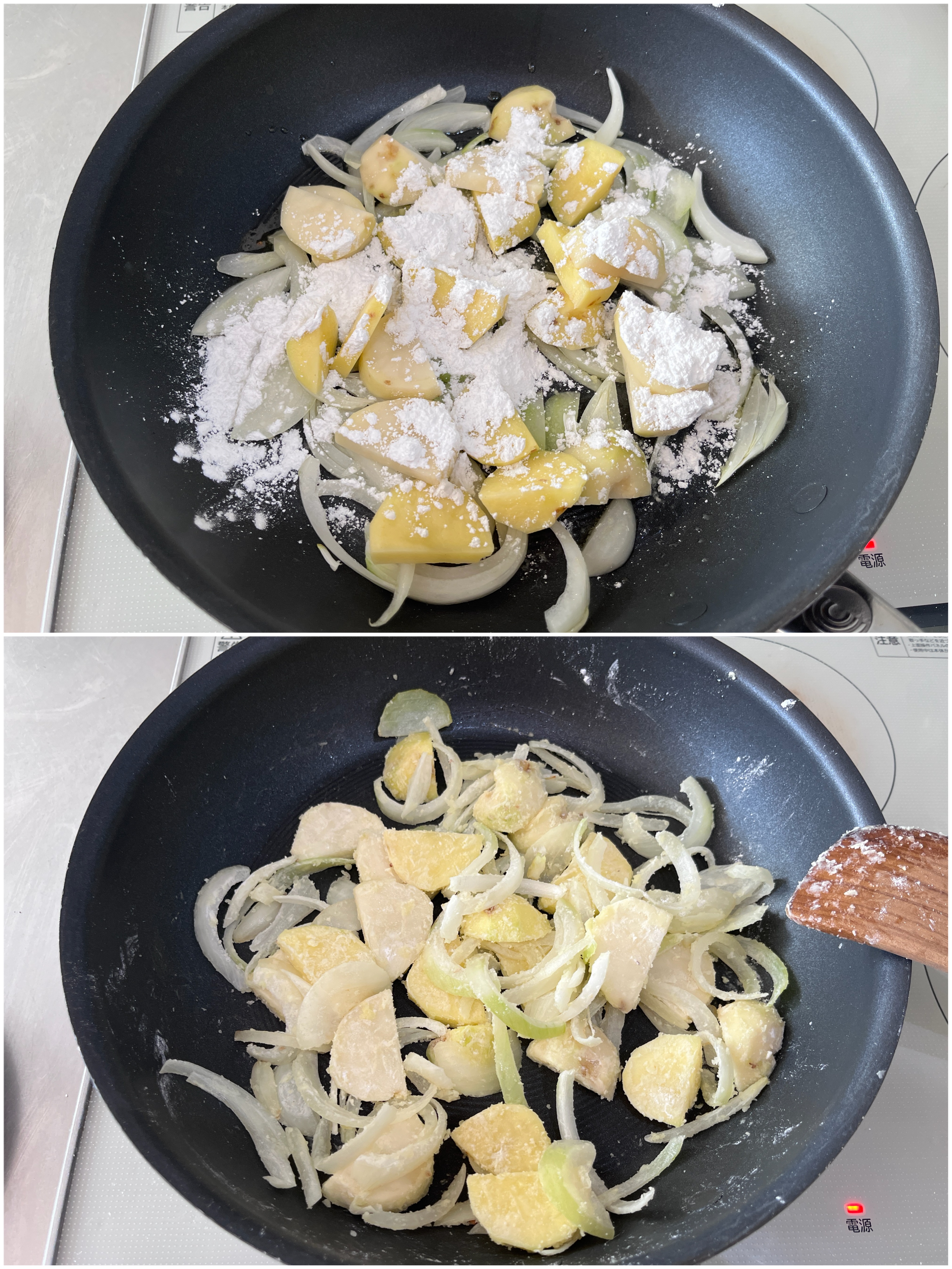 じゃがいもを加え、米粉を振り入れて粉気がなくなるまで炒める。