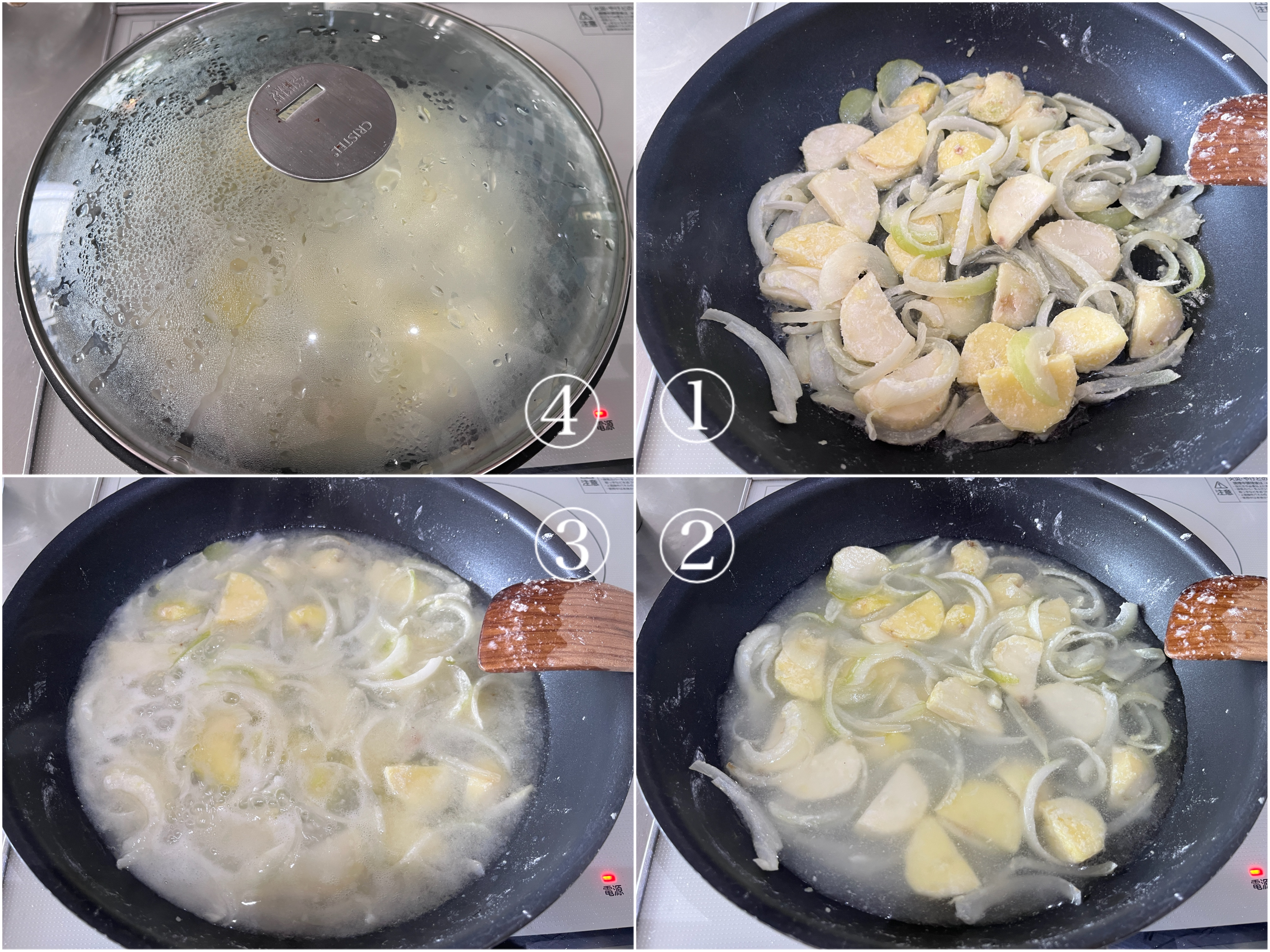 白ワインを加えて一煮立ちさせ、水300mlと塩を加えて煮立ってきたら蓋をして弱火で3分煮る。