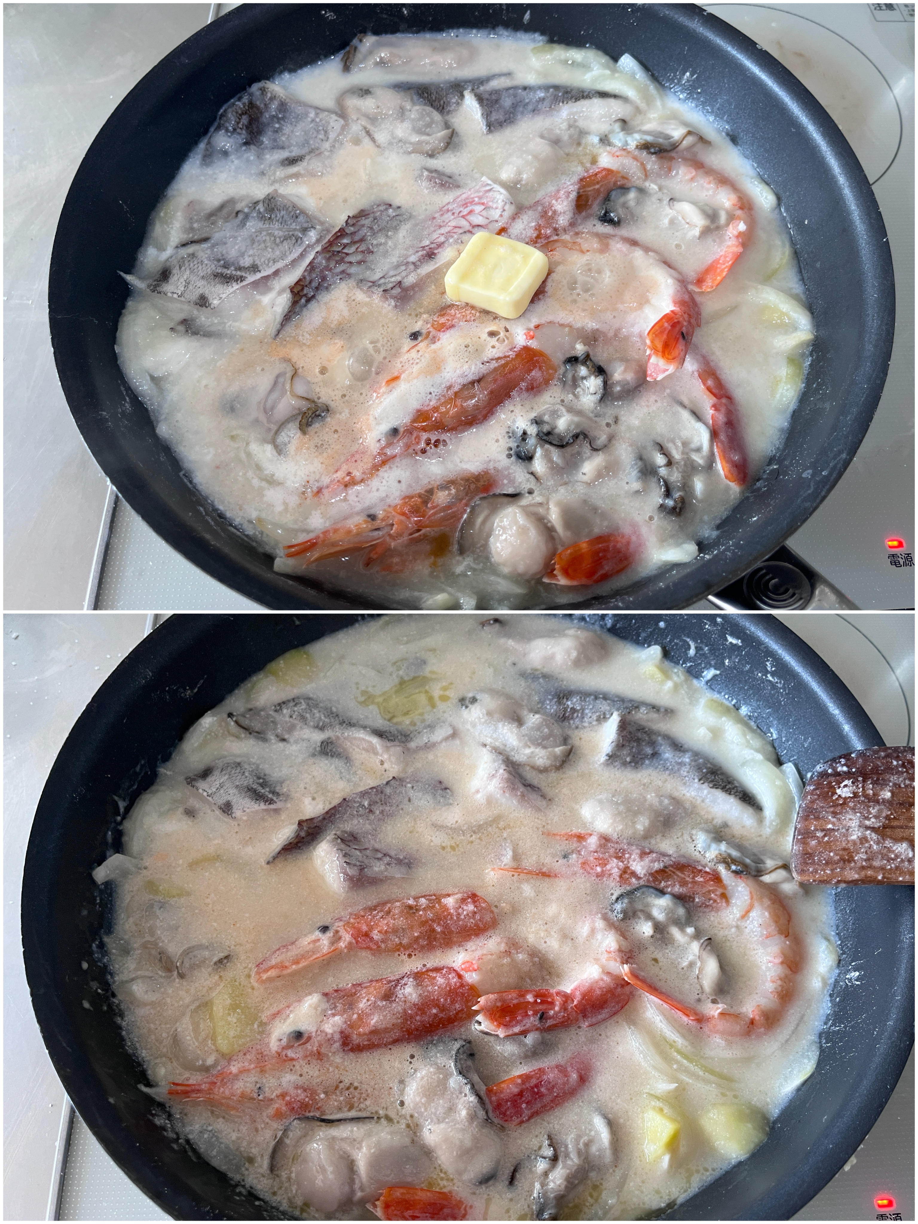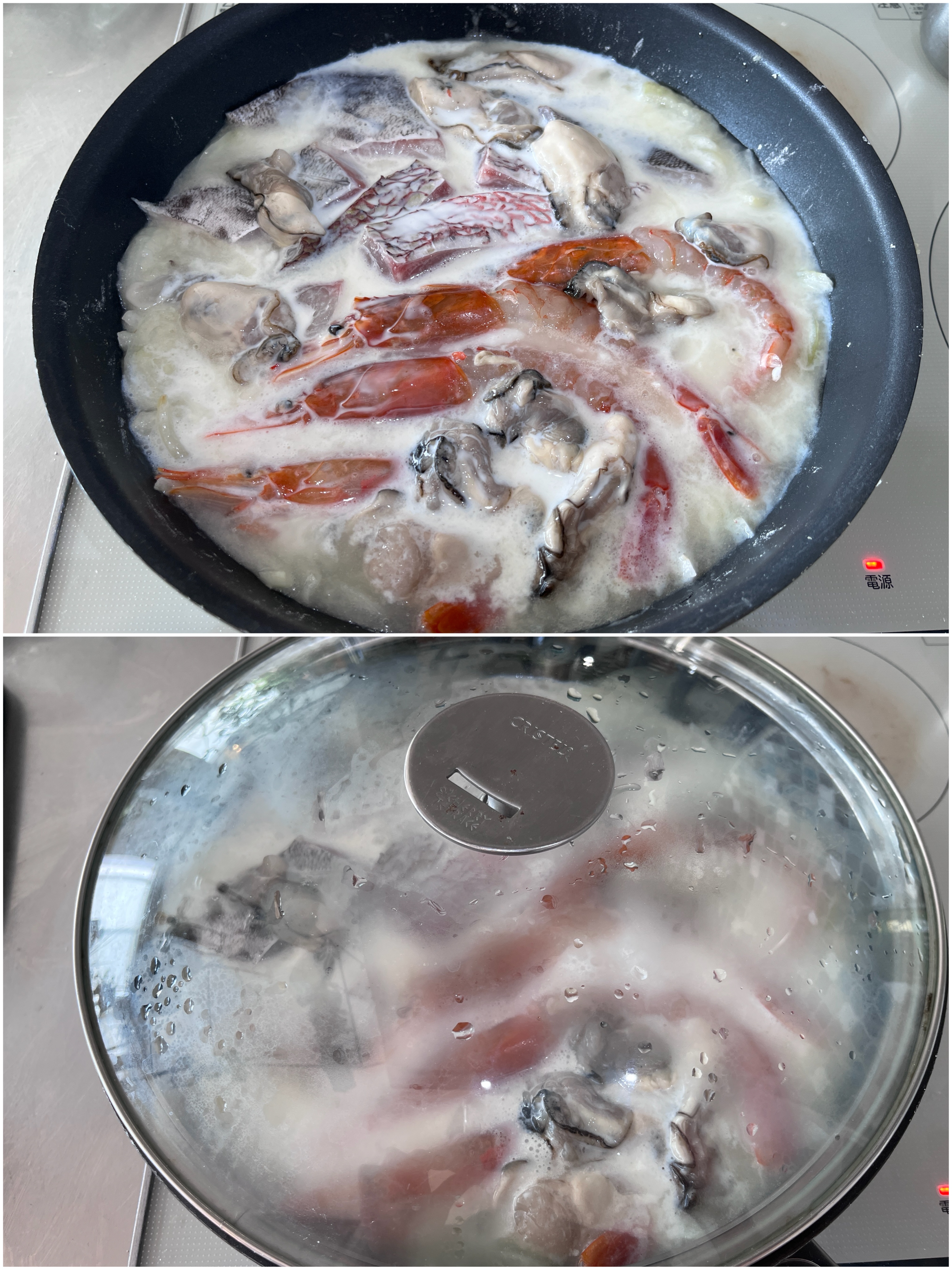 魚、えび、牡蠣、牛乳を加え中火にして煮立ってきたら、蓋をして弱火で3〜4分魚介に火が通るまで煮る。
