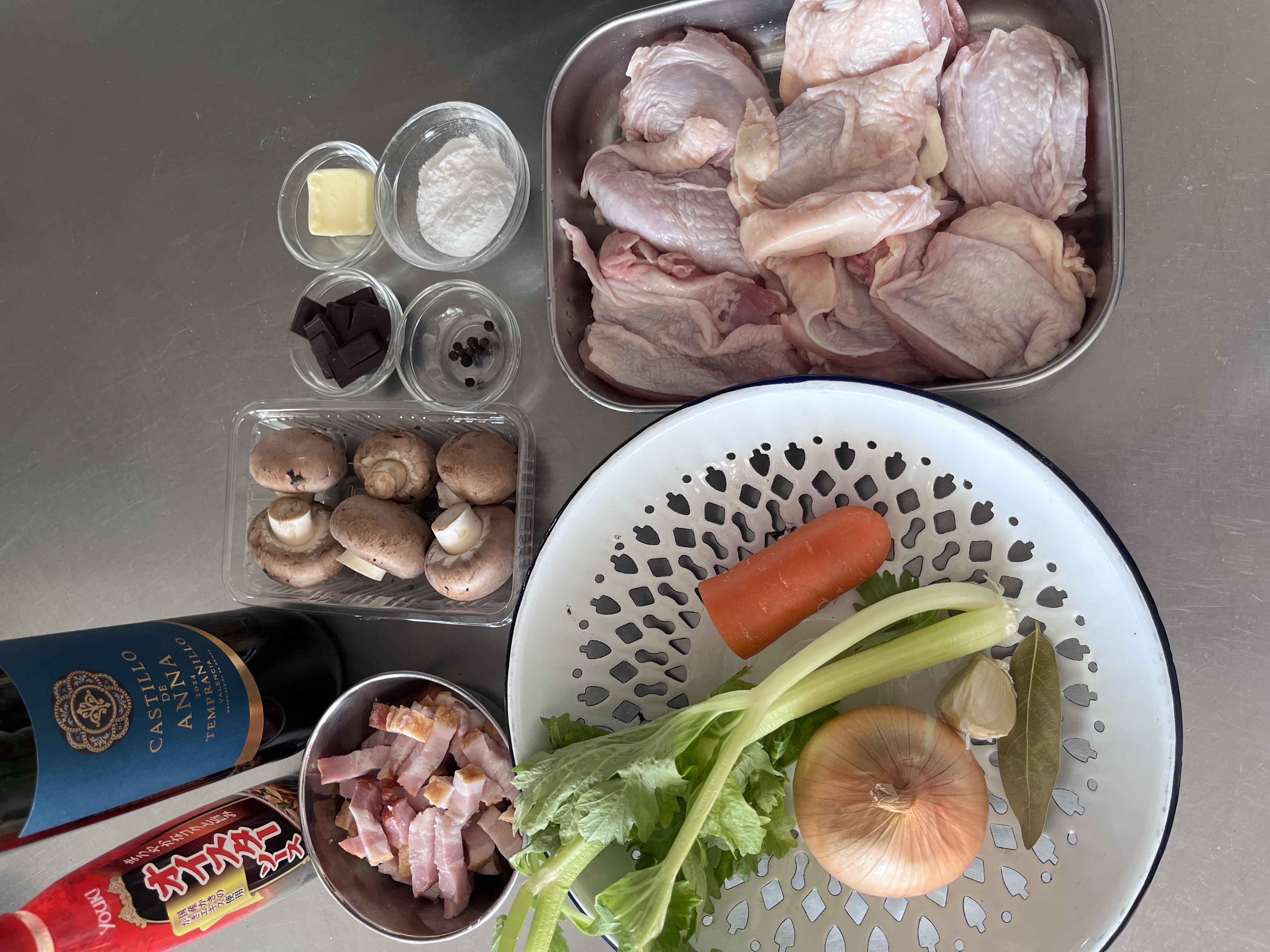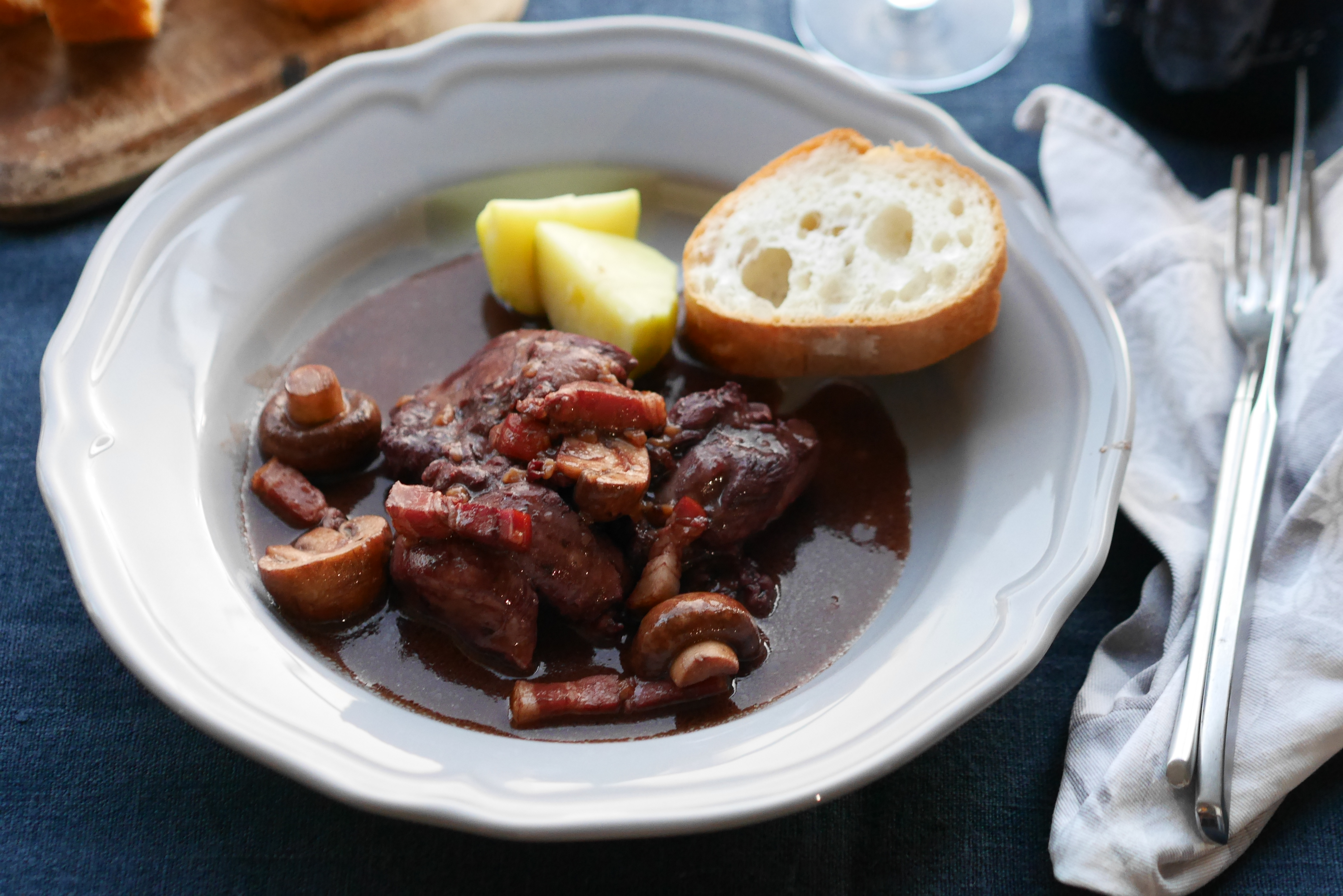 フランス語でコック・オー・ヴァンと呼ばれるこの料理は、ブルゴーニュ地方の郷土料理。たっぷりのブルゴーニュワインを使って煮込むのが本場流ですが、ちょっと贅沢なので、高くなくとも果実味のあるワインで作るのがおすすめです。じっくりと煮込んだほろほろな鶏肉に、チョコレートを加えてコクと深みを出した赤ワインソースを絡めれば、これだけでちょっと贅沢なディナーになります^^