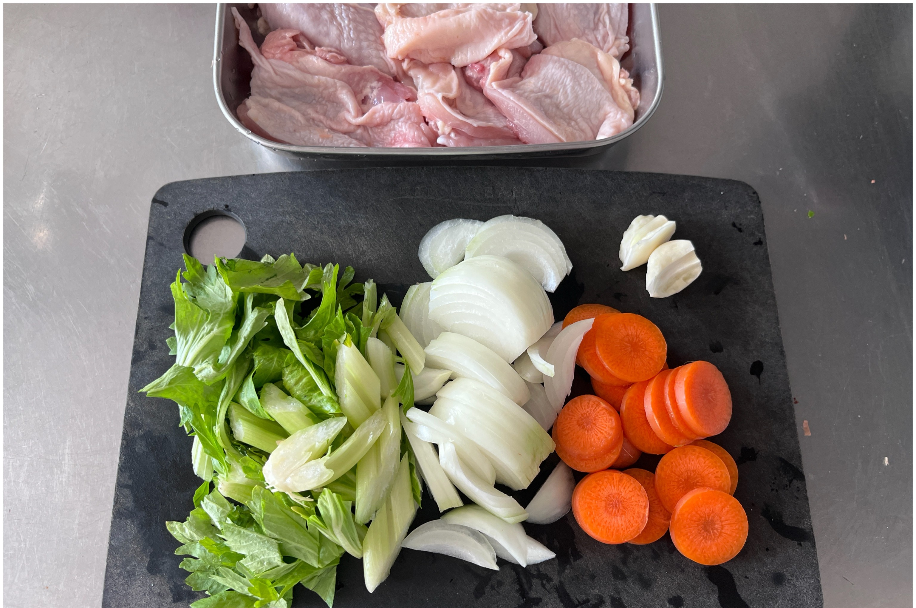 玉ねぎは薄切りに、にんじんは薄い輪切りに、セロリの葉は斜め薄切りにする。にんにくは皮を剥いて潰す。鶏肉は、1枚を4等分に切る。