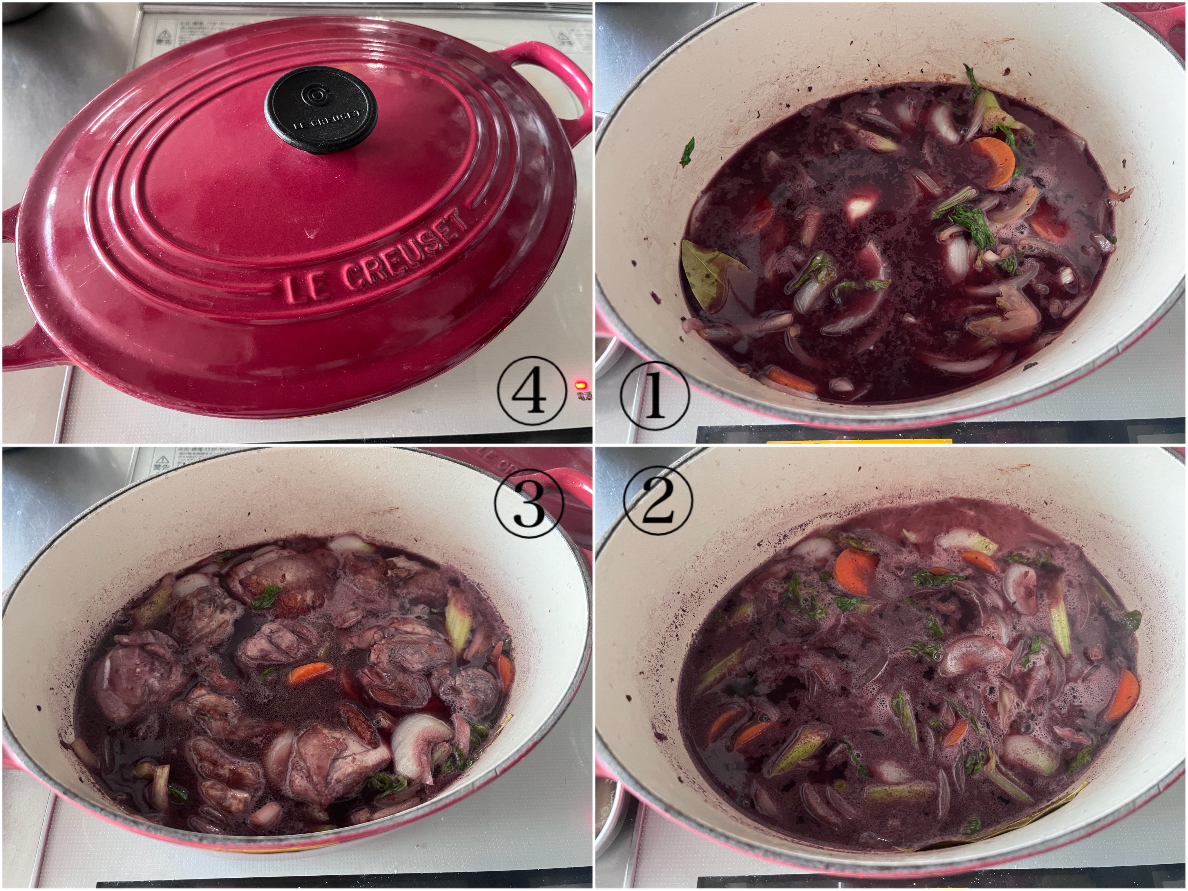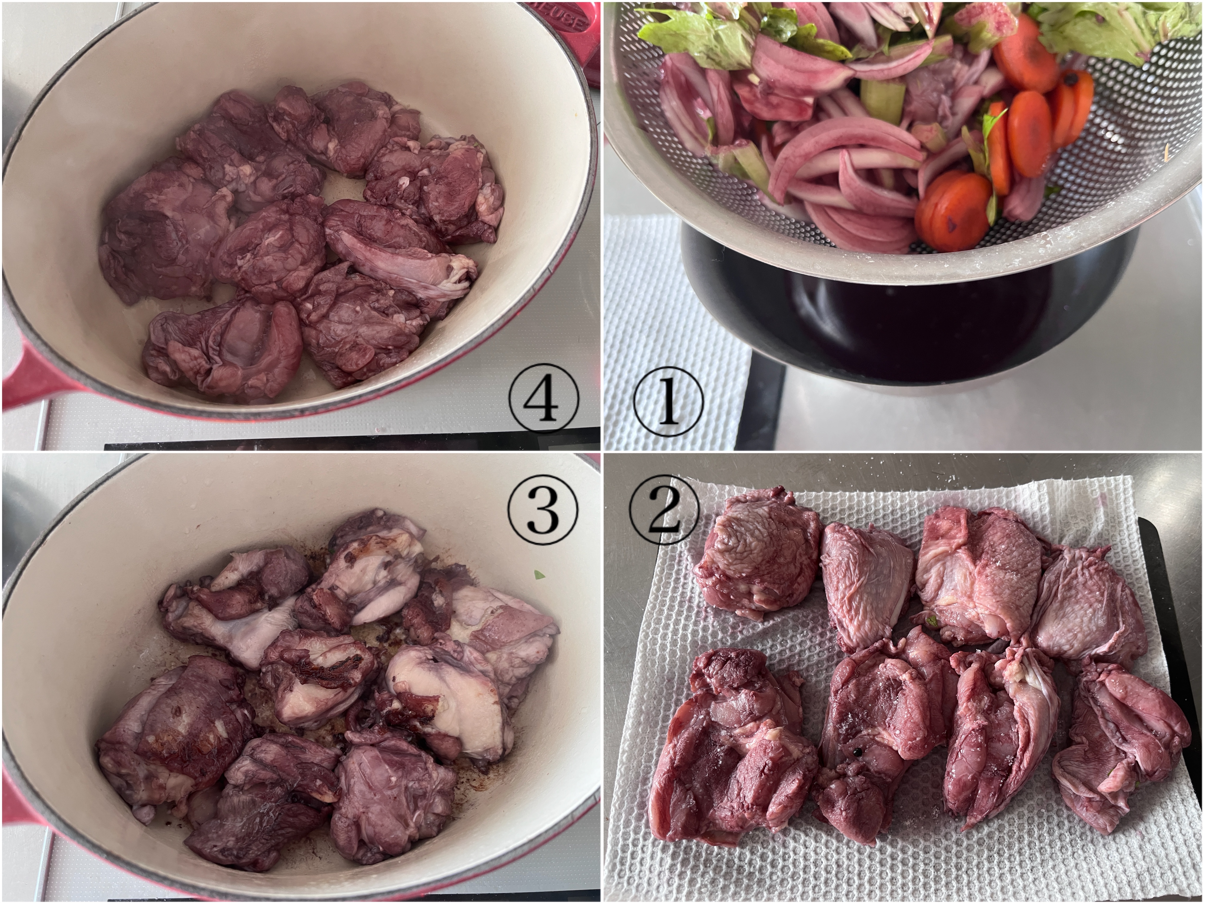 ③で取り分けておいた漬け汁と、塩を加えて煮立て、鶏肉を鍋に戻し再沸騰してきたら蓋をして弱火で30分煮込む。