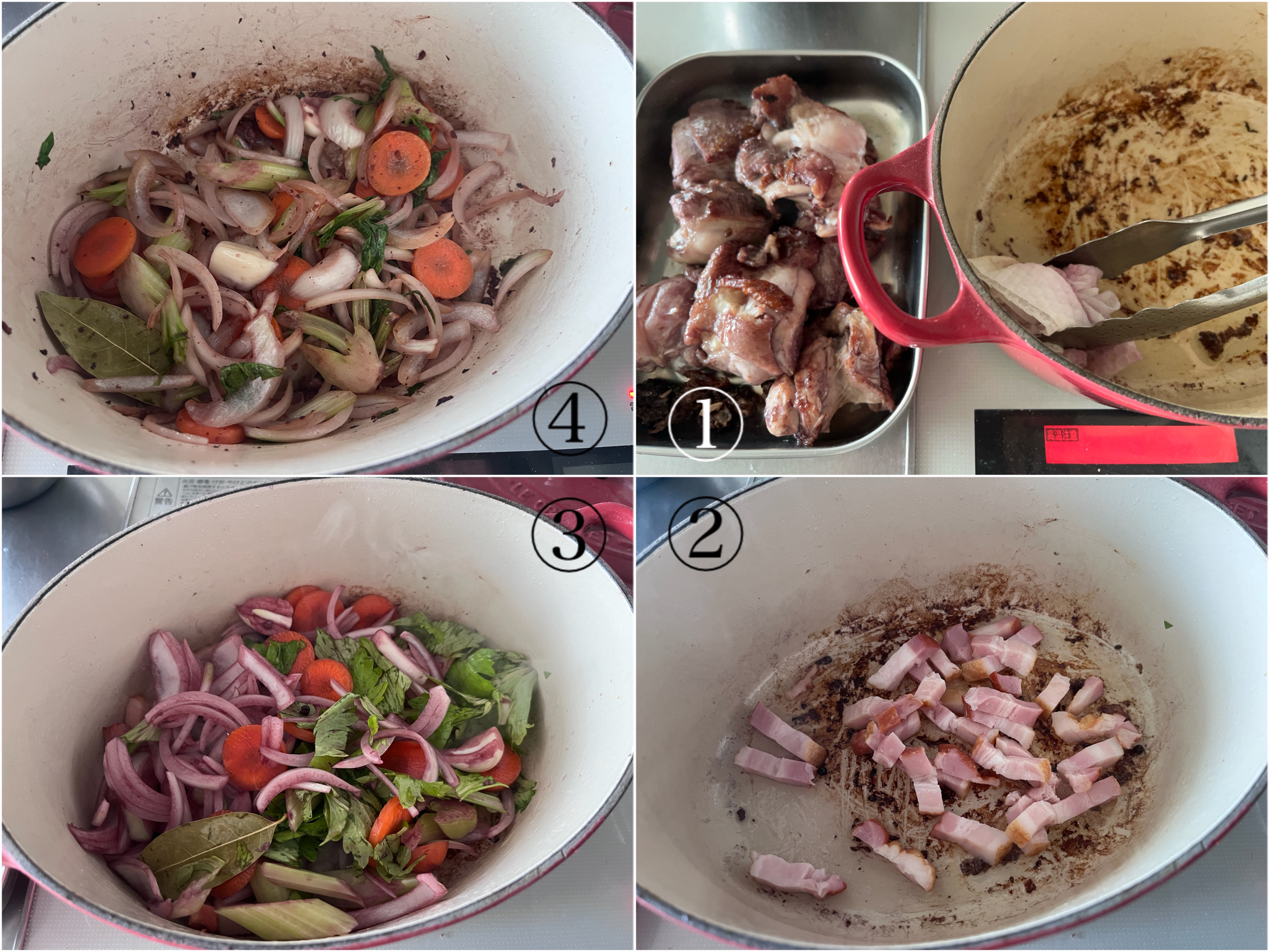 鍋に残った余分な油を捨てベーコンを入れ、弱火で2分ほど時々返しながら炒めて取り出す。次に、①で切った野菜をザルで越してから加えて、中火にして2分炒める。