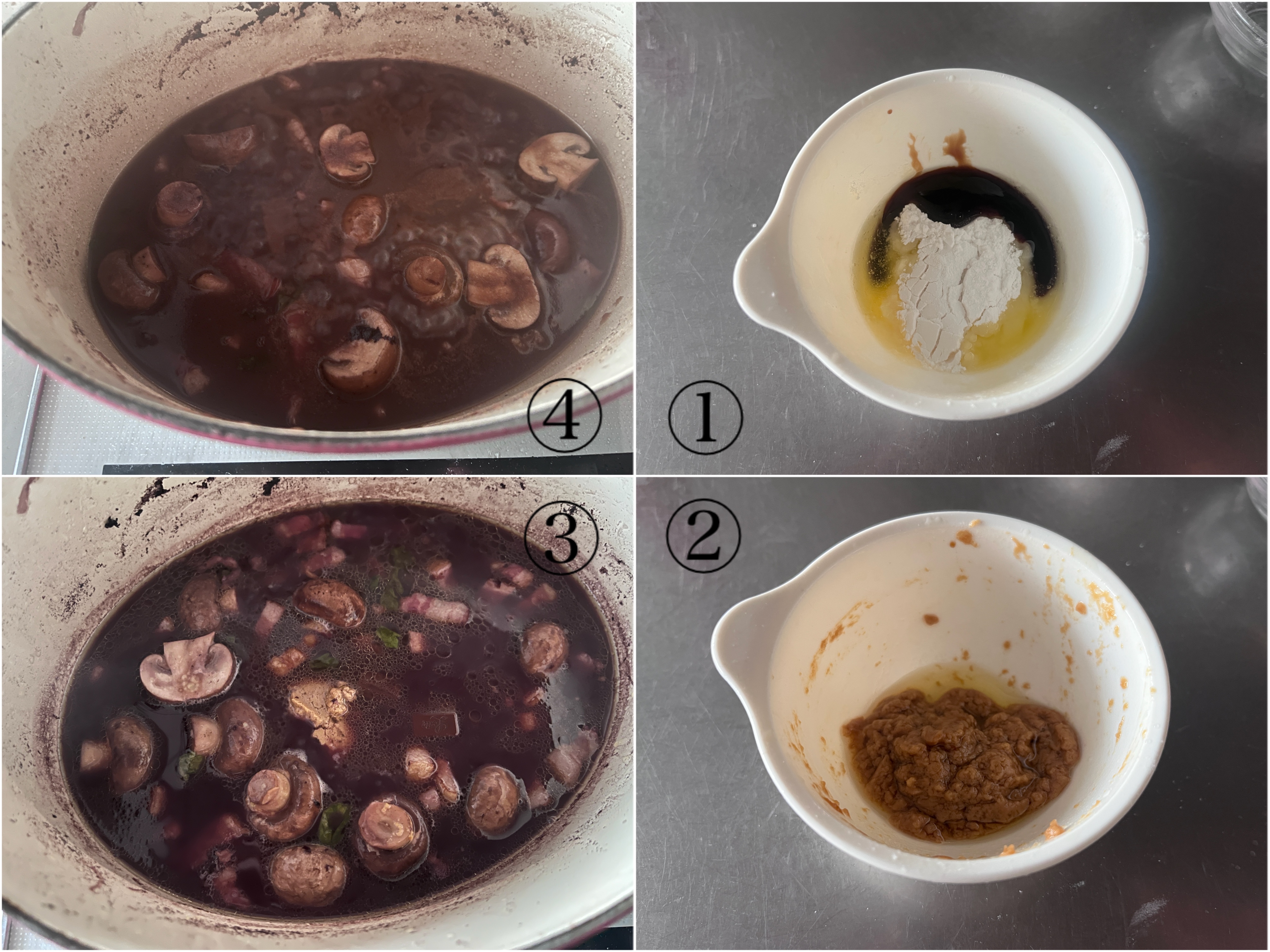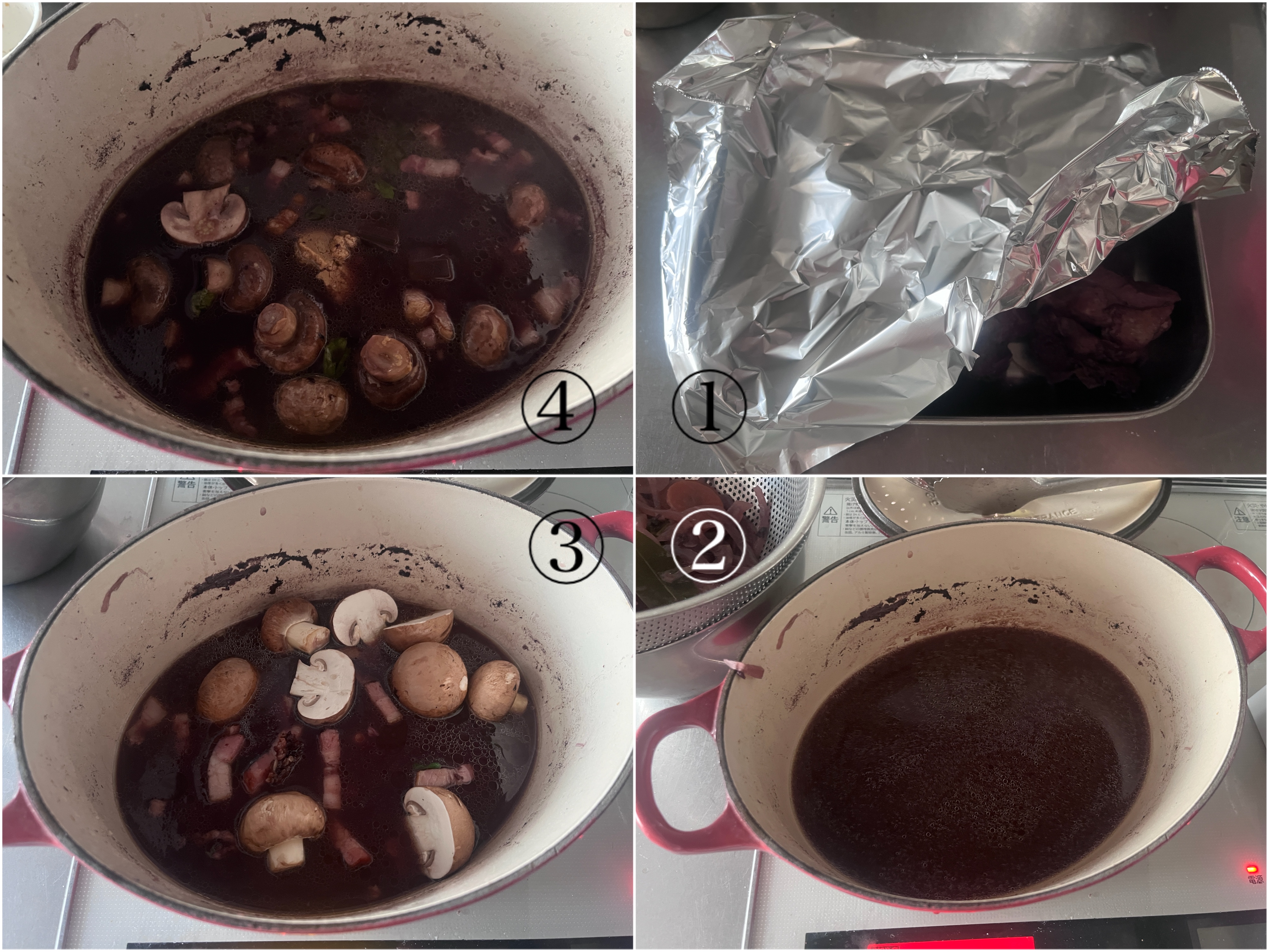 鶏肉を取り出しアルミで覆って保温する。再度鍋の煮汁を濾し、その煮汁とベーコンを鍋に戻し入れマッシュルームを加えて中火にかけ、煮立ってきたら弱火で、5分ほど煮込む。