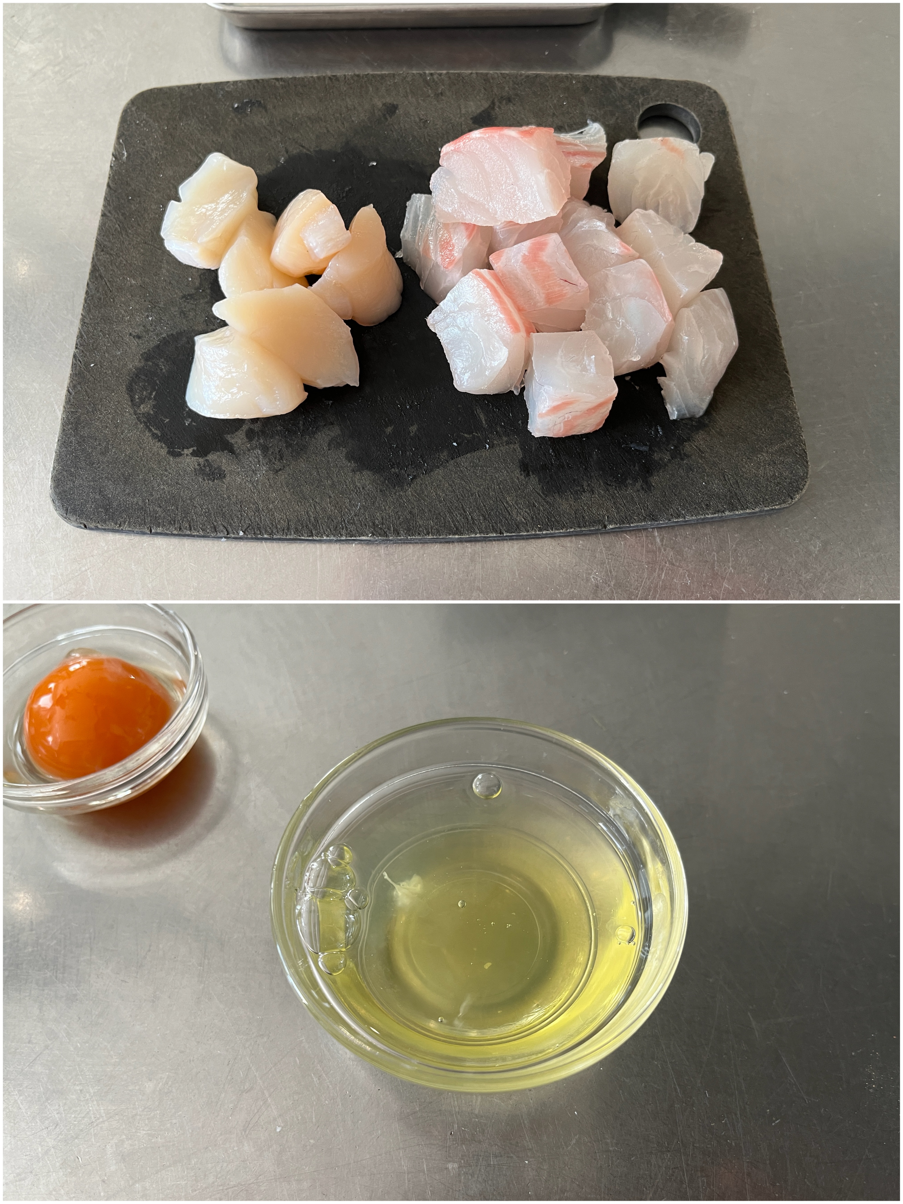真鯛とほたては合わせて150g用意し、小さめの角切りにする。卵白を分けておく。