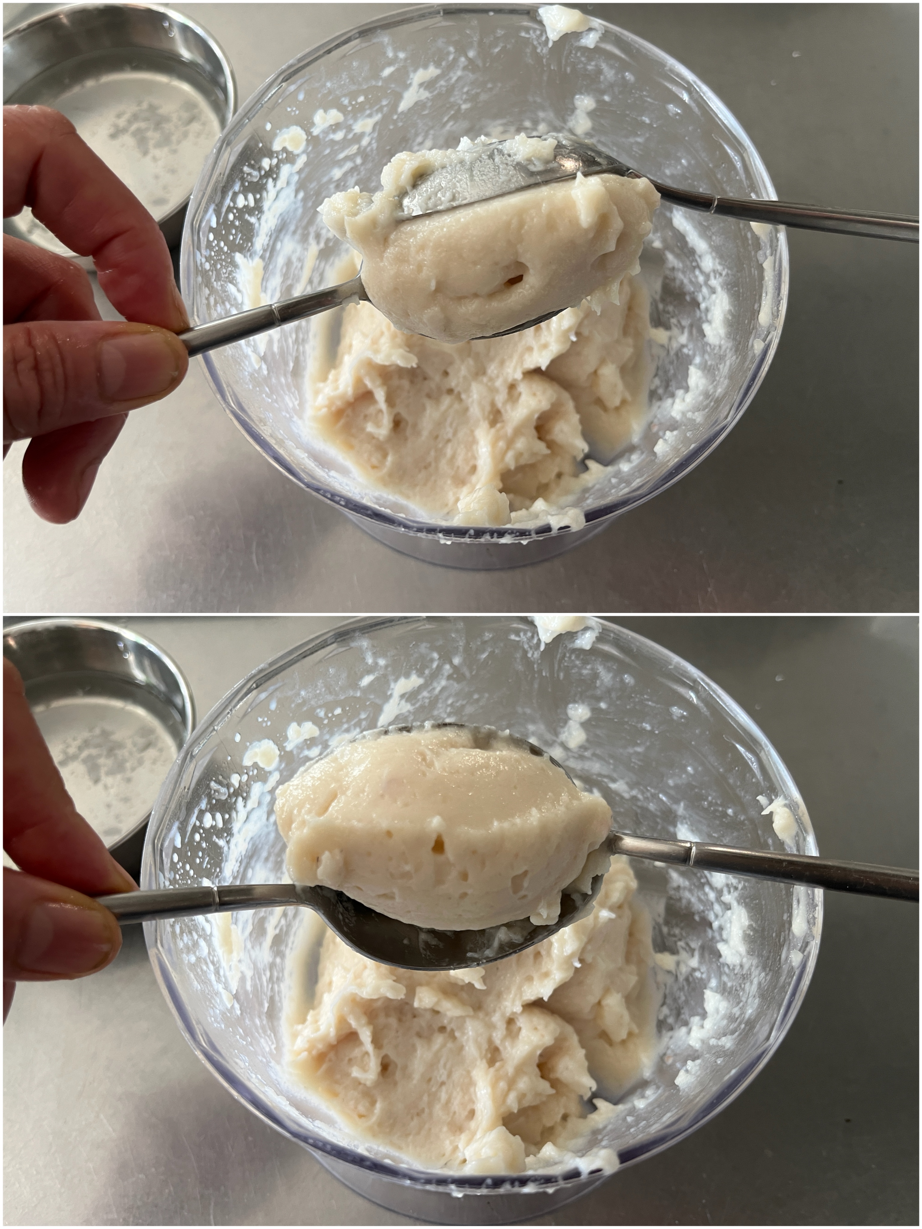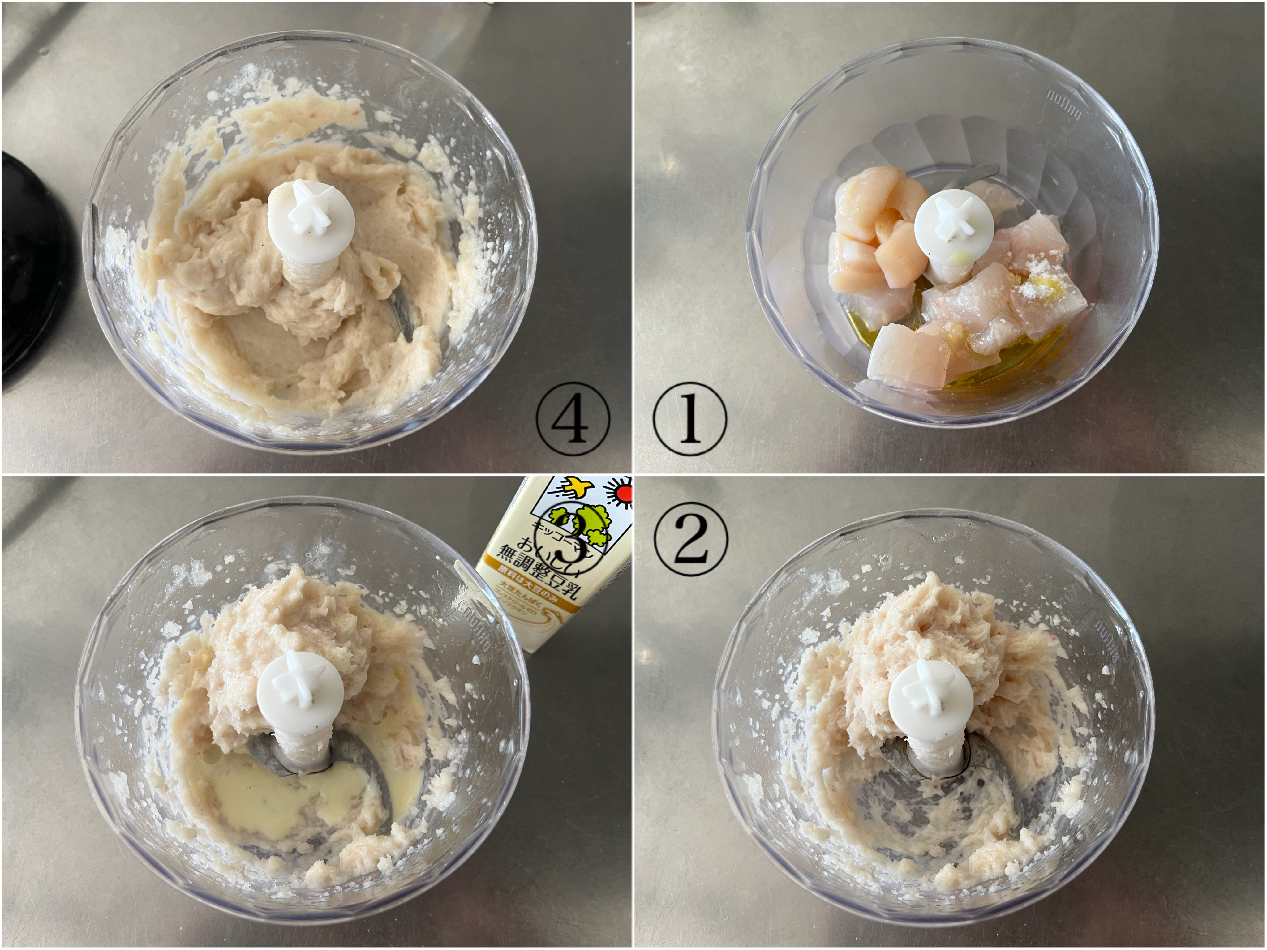 フードプロセッサーに1とAの材料を全て入れて撹拌する。続けて牛乳または豆乳を大さじ1くらいずつ数回に分けて加え、その都度撹拌し、写真④くらいの滑らかさにする。