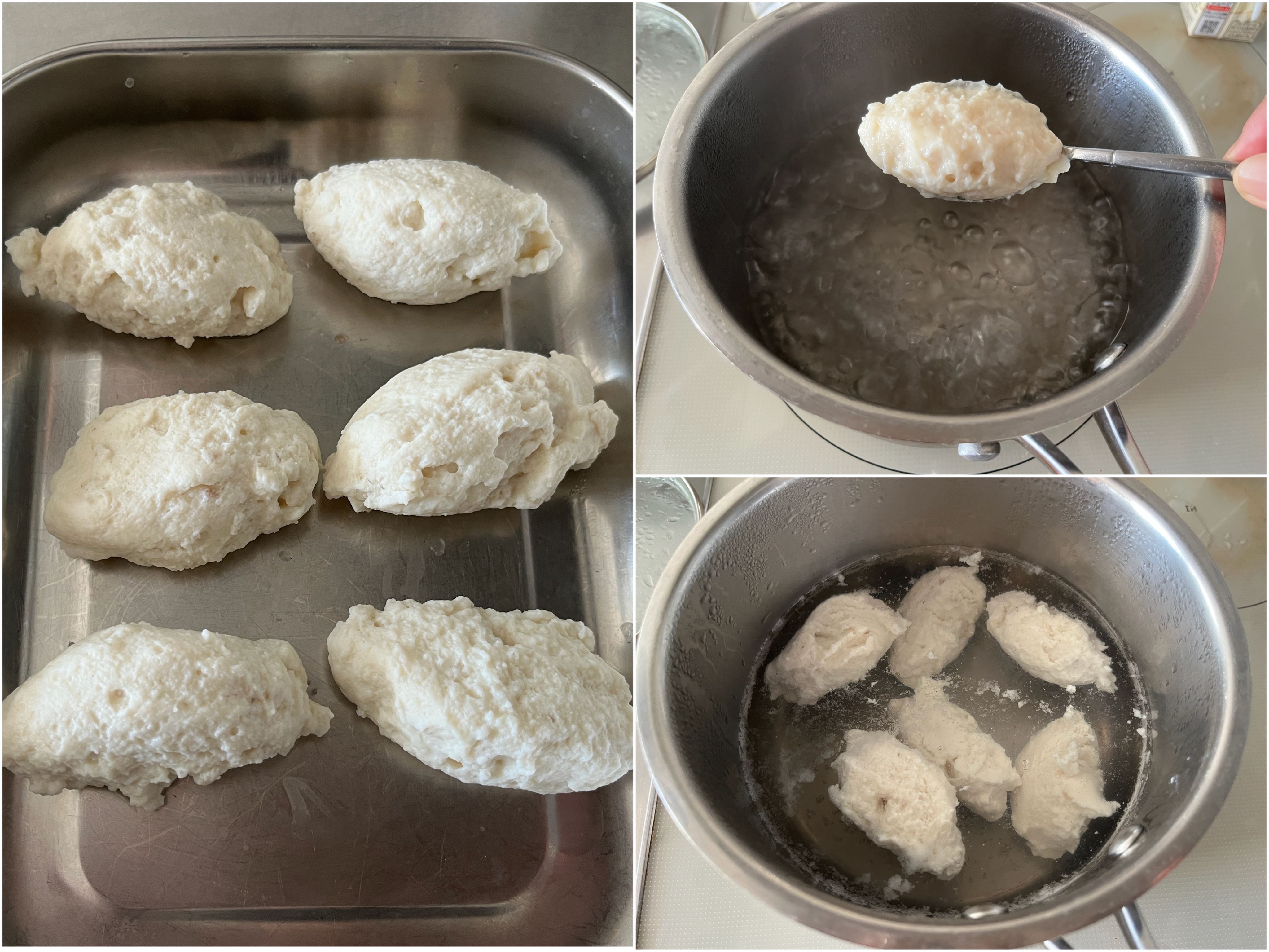 大きめのスプーン2本を使ってラグビーボール状に成型する。(スプーンを水に濡らしながら使うと成形しやすい。)