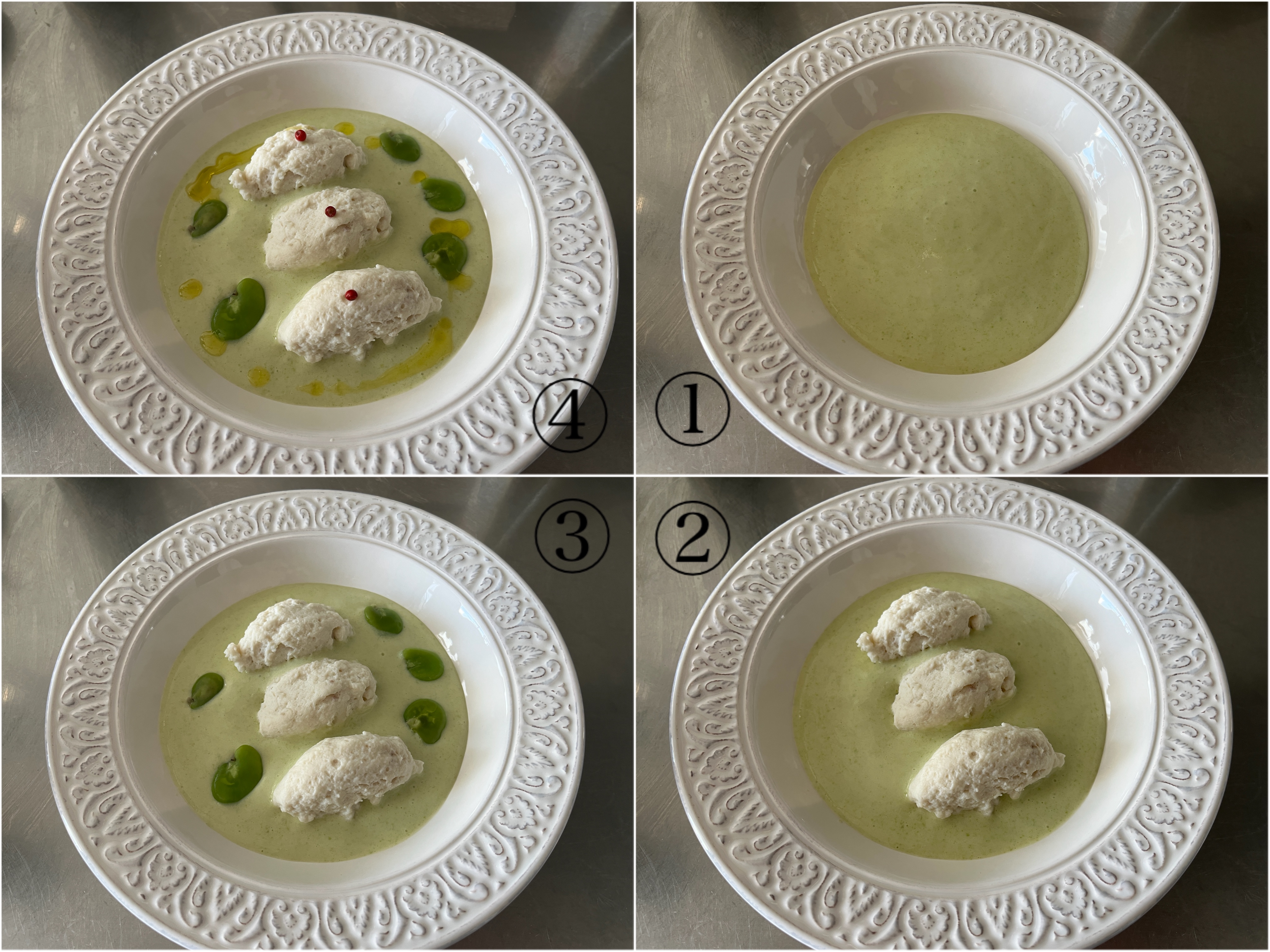 皿にソースを流し入れ、その上にクネルをのせる。お好みで飾り用そら豆数粒とピンクペッパーを飾り、オリーブオイル(分量外)をまわしかける。