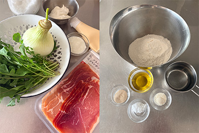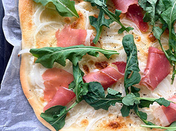 タルトフランベとは、アルザス地方で作られる、薄焼きパンにフロマージュ・ブランなどのフレッシュチーズを塗ってベーコンや玉ねぎを乗せて焼くピザのこと。日本ではなかなか入手しにくいフロマージュ・ブランを、マスカルポーネとヨーグルトで代用し、旬の新玉ねぎを主役に、程よい塩気の生ハム、香ばしい香りのルッコラを添えて、春満載なふわふわ生地のタルトフランベに仕上げました。