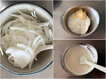 新玉ねぎをスライスし、Bの材料をボウルに入れてよく混ぜ合わせクリームを作る。