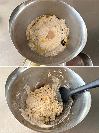 Aを全てボウルに入れ、周りからぬるま湯120mlを注いでゴムべらで粉と水が混ざり合うまでざっくりと混ぜる。