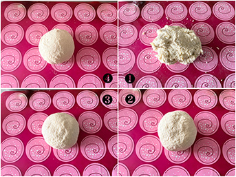 手のひらでだいたいひとまとまりにしたら台の上に取り出し、5〜10分ほど滑らかになるまで捏ねる。(どんな捏ね方でも、ホームベーカリーの捏ね機能を使っても写真くらいの滑らかさになればOK)