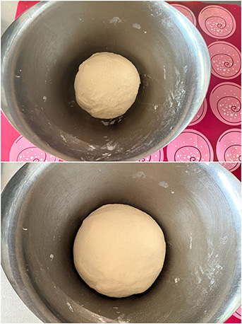 綺麗に丸めてボウルに戻し、ラップをして35℃で30分ほど、1.5倍くらいになるまで発酵させる。(オーブンを250℃に予熱する)