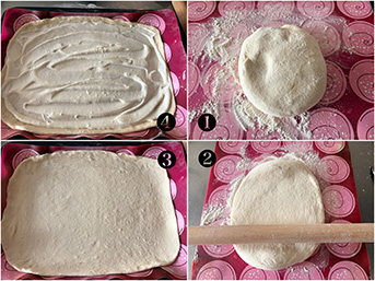 台に取り出し、打ち粉をして麺棒で天板の大きさに伸ばし、1で混ぜ合わせたクリームを全体に広げるように塗る。