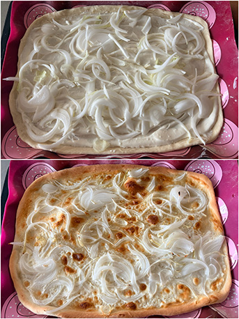 新玉ねぎのスライスをクリームの上全体に乗せ、250℃に予熱したオーブンで15〜20分ほど、こんがりと焼き色がつくまで焼く。