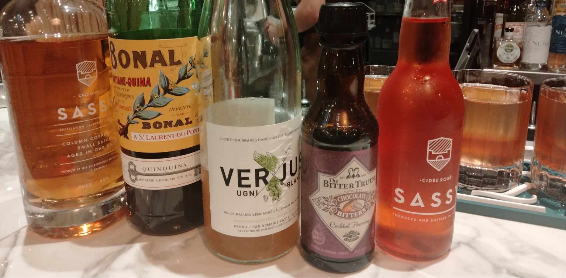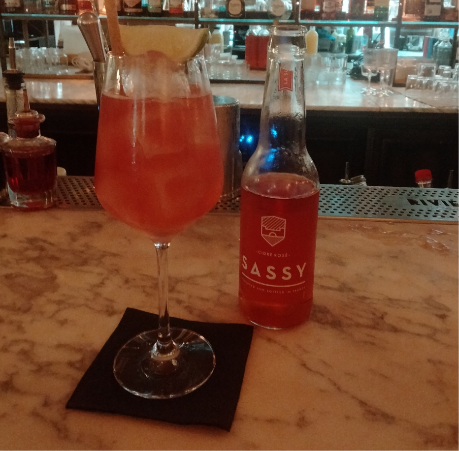 ボルドーの中心地にあるおしゃれなレストラン内に併設されたバーにて、SASSYロゼとカルヴァドスを使ったカクテルをいただきました。